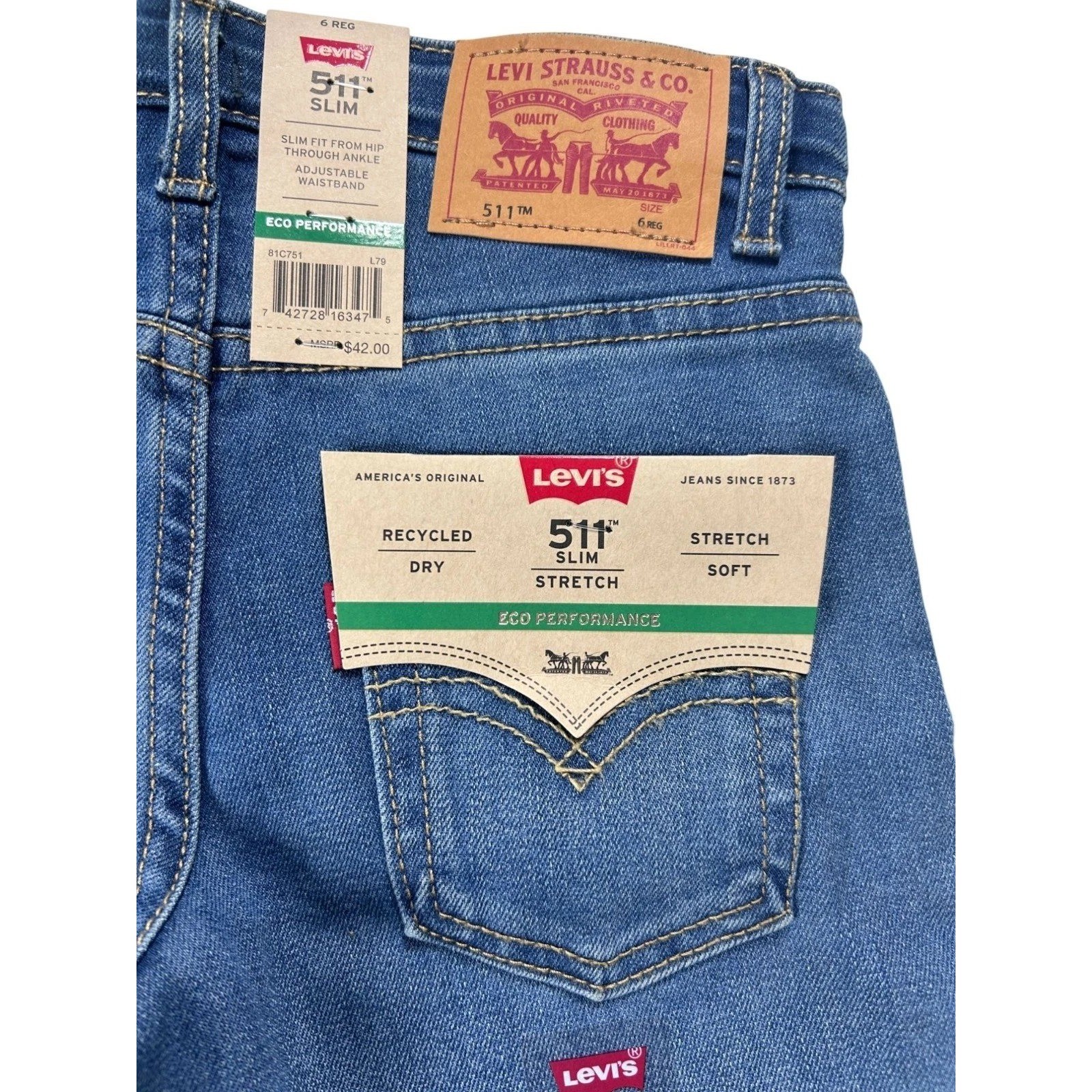 как выглядит Levis 511 Slim Fit Jeans Boys Sz 6 Regular Adjustable Waistband Blue Denim NEW фото