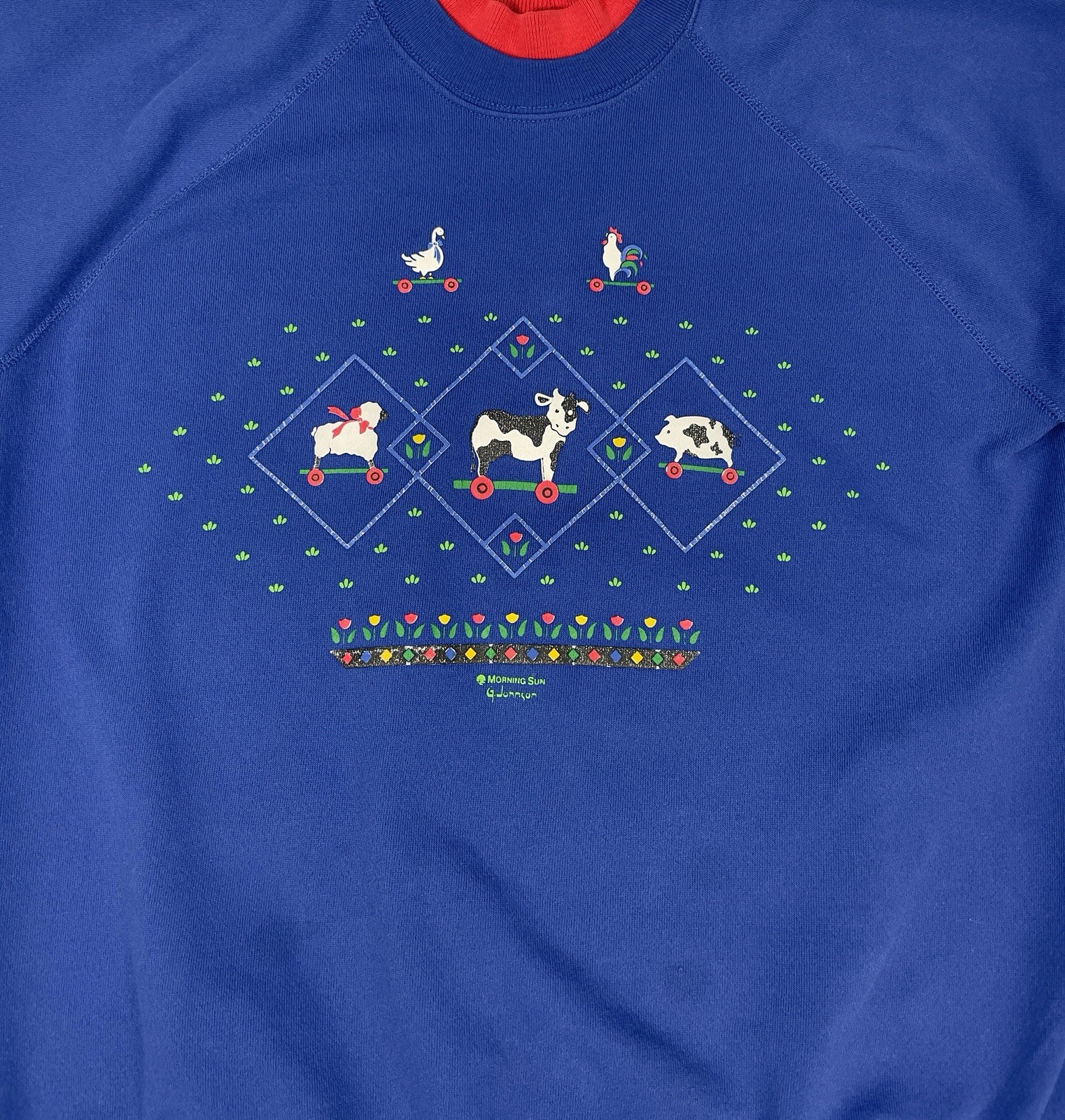 Vintage Morning sun Crewneck Sweatshirt Medium Farm Animals Blue Red 90 s