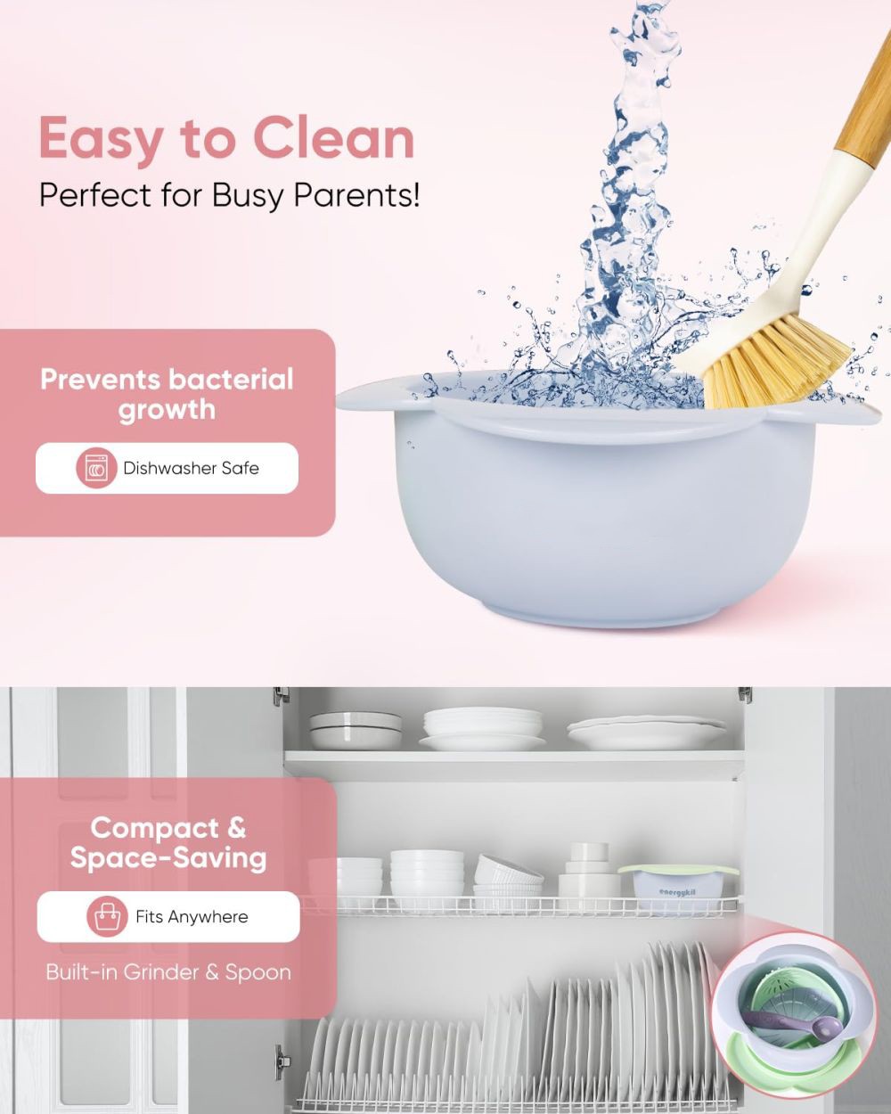 2in1 Baby Food Mash and Serve Bowl Built-in Grinder Spoon Lid and Non-Slip Base