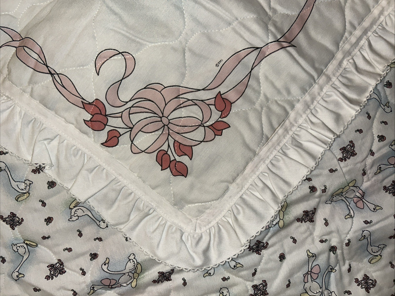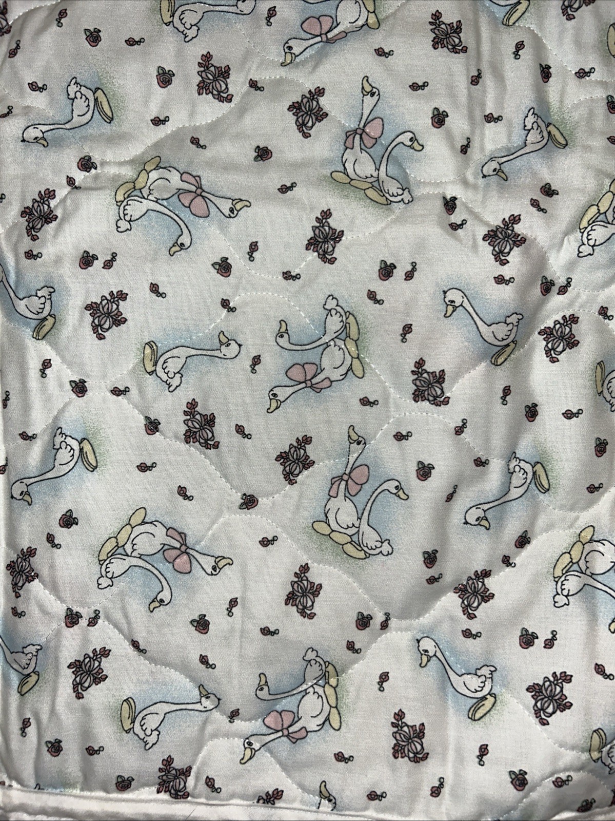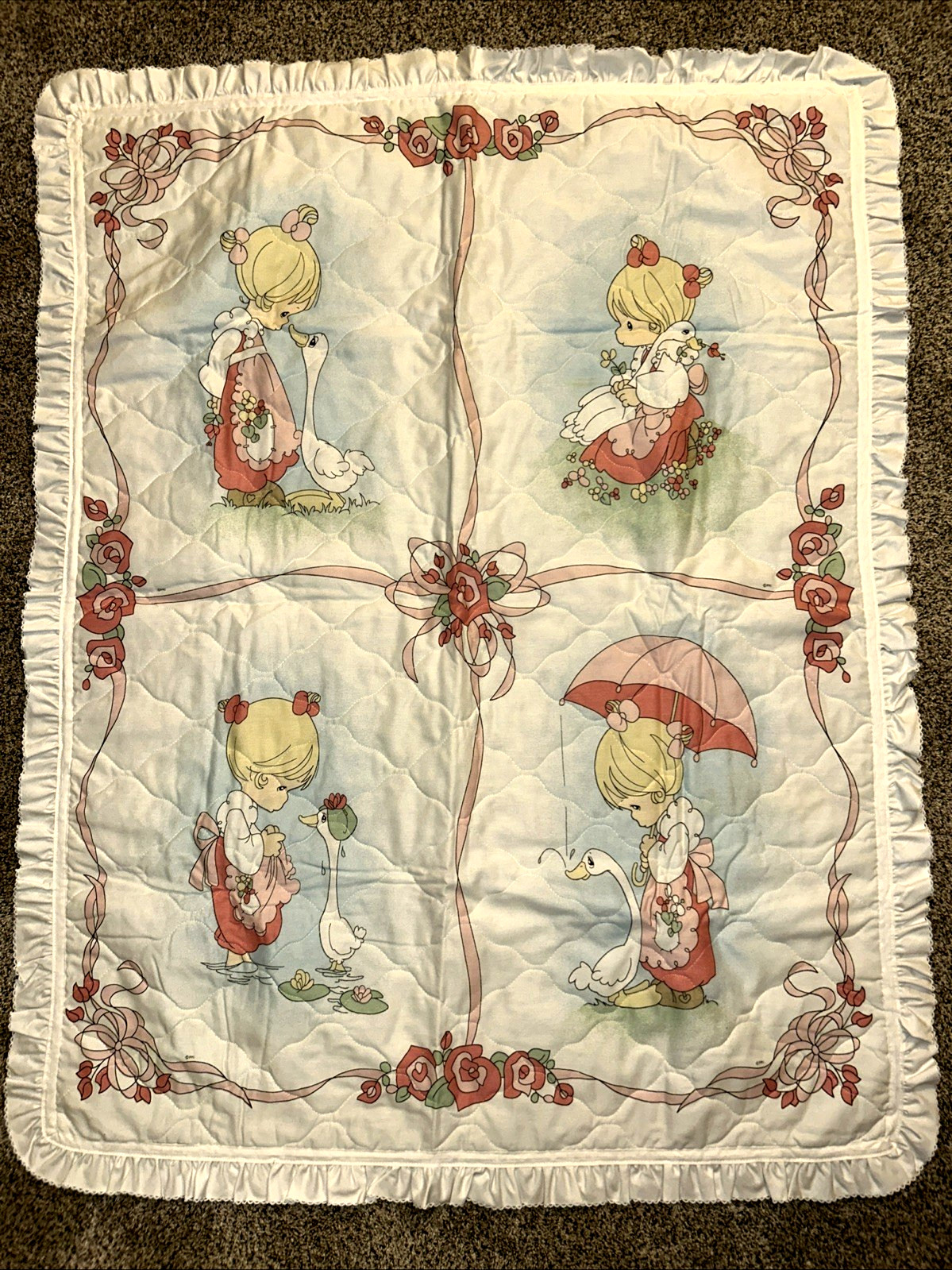 VTG Precious Moments Girl Goose Ruffle Trim Baby Blanket Quilt