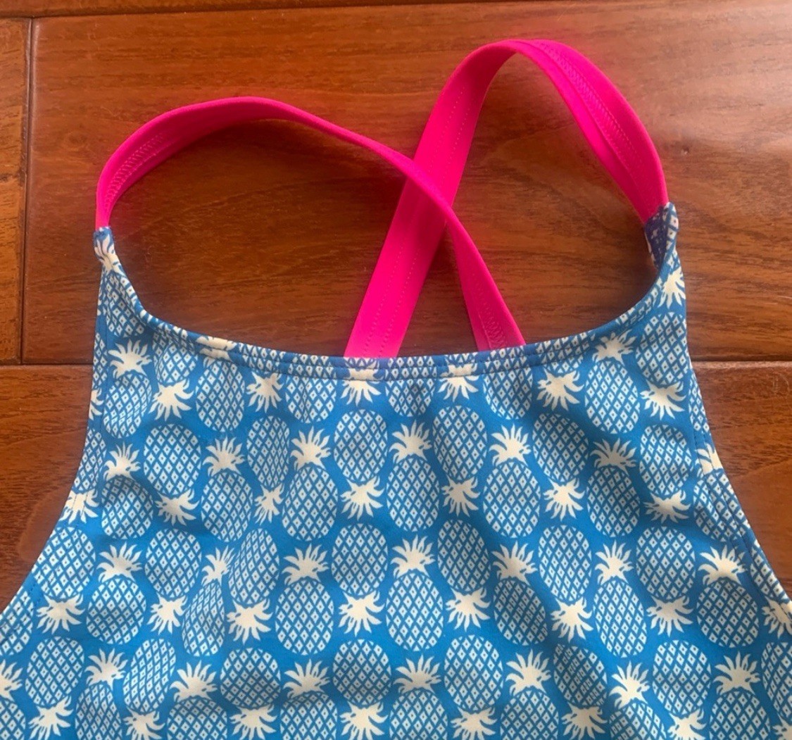 Boden Cross Back Swimsuit Girls Size 8-9Y Blue Pineapple Print One Piece 135cm