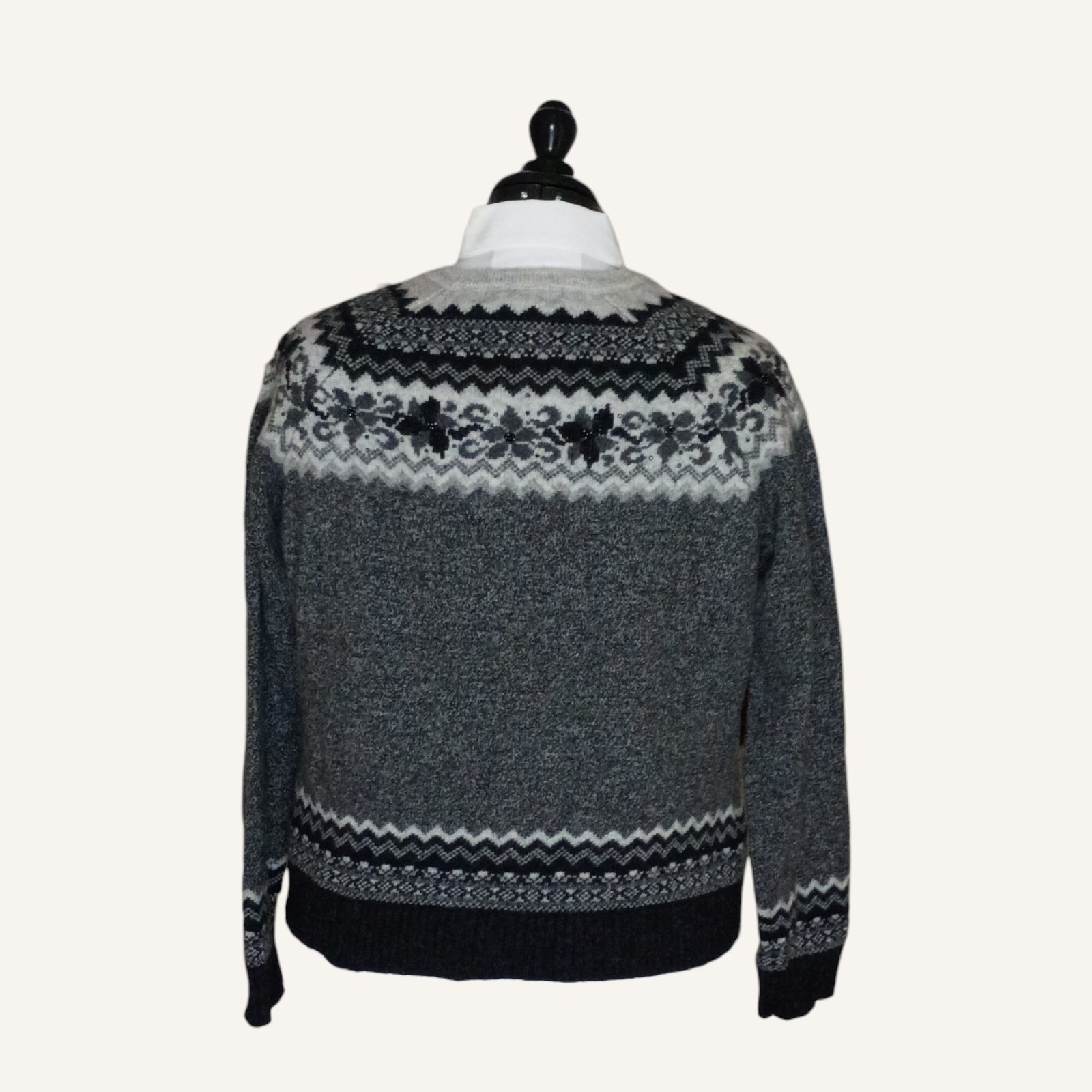 Eddie Bauer Women's Gray Ivory Lamb's Wool Nordic Fair Isle Cardigan Size XL
