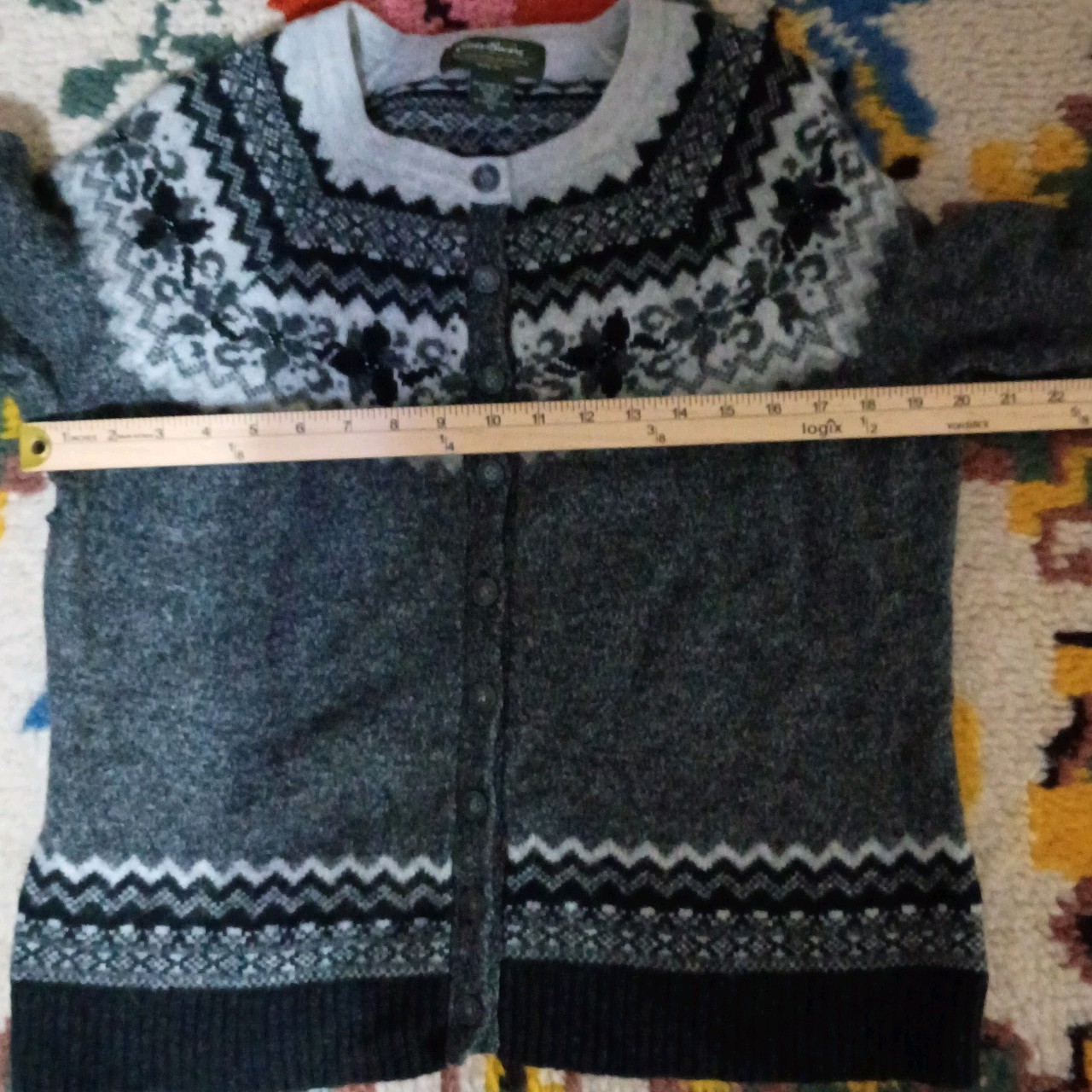 как выглядит Eddie Bauer Womens Gray Ivory Lambs Wool Nordic Fair Isle Cardigan Size XL фото