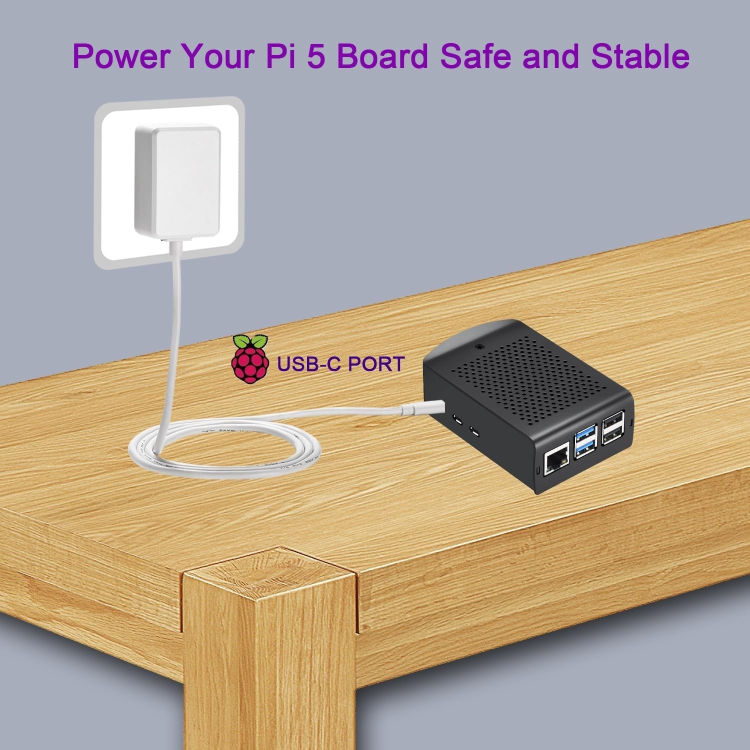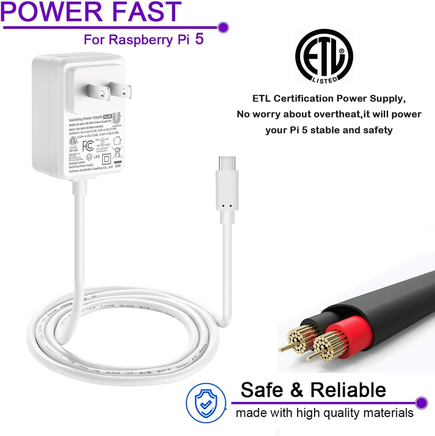 PD USB-C 27W Power Supply for Raspberry Pi 5, Cable Length 47 inch 5.1V 5A GaN P