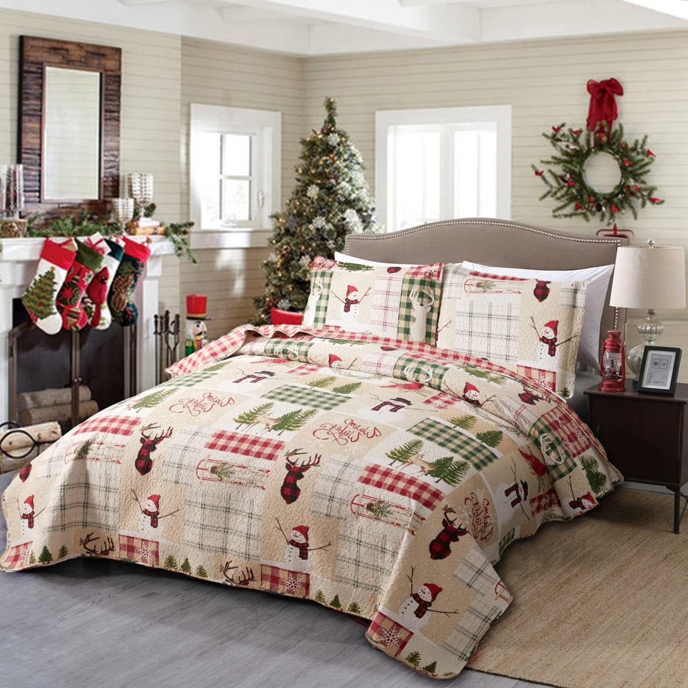 Christmas Quilt Set King Size Christmas Bedding Reversible Quilt Rustic Lodge...