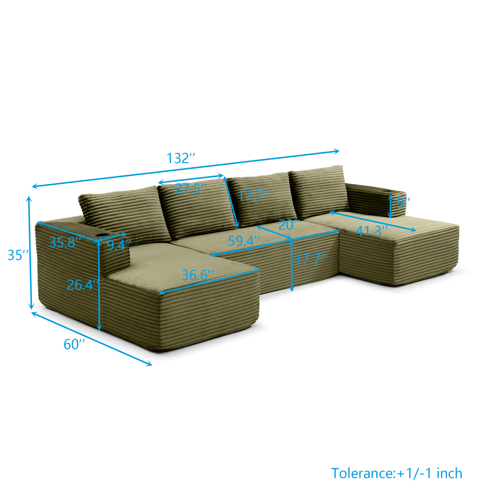 132 Oversized Cloud Boneless Sofa Couch with Chaise, Modern Corduroy U Shape
