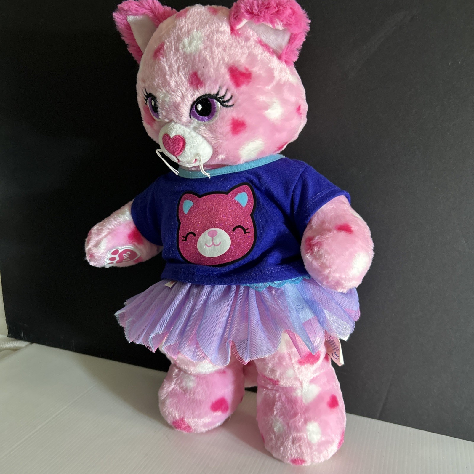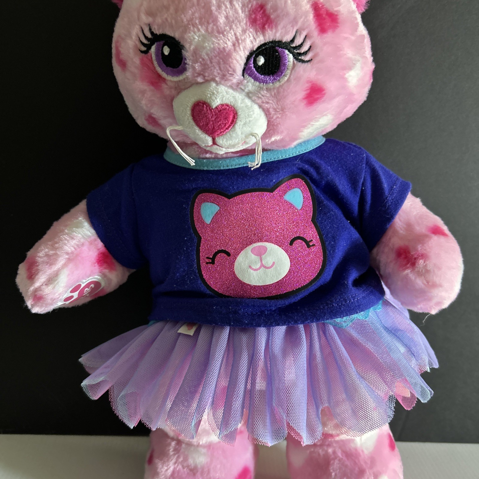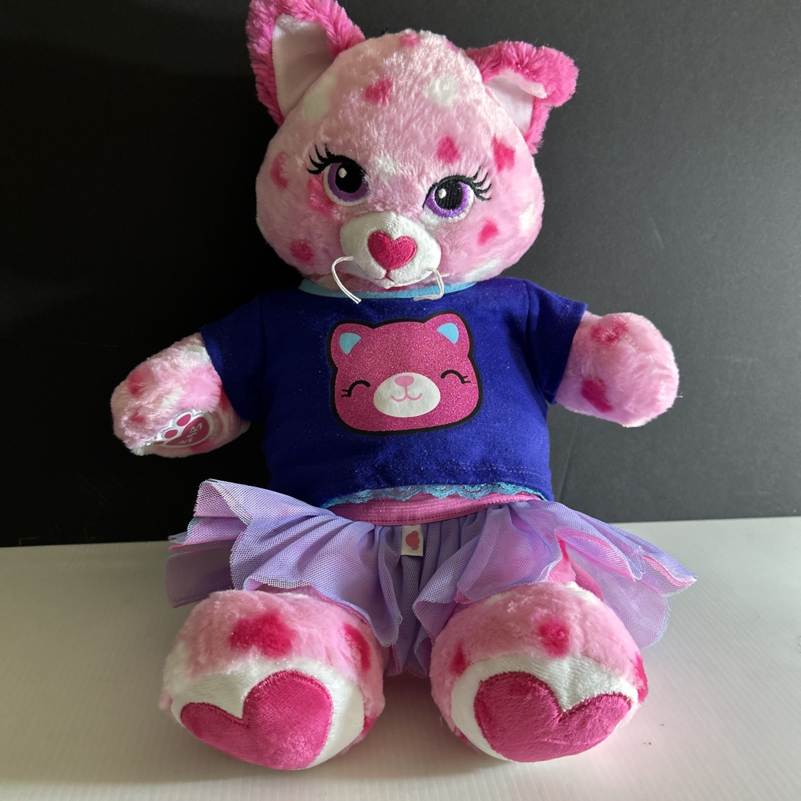 как выглядит Build a Bear BAB Bright Pink Cat Purple Navy Top Mesh Skirt Heart Feet Plush 16" фото