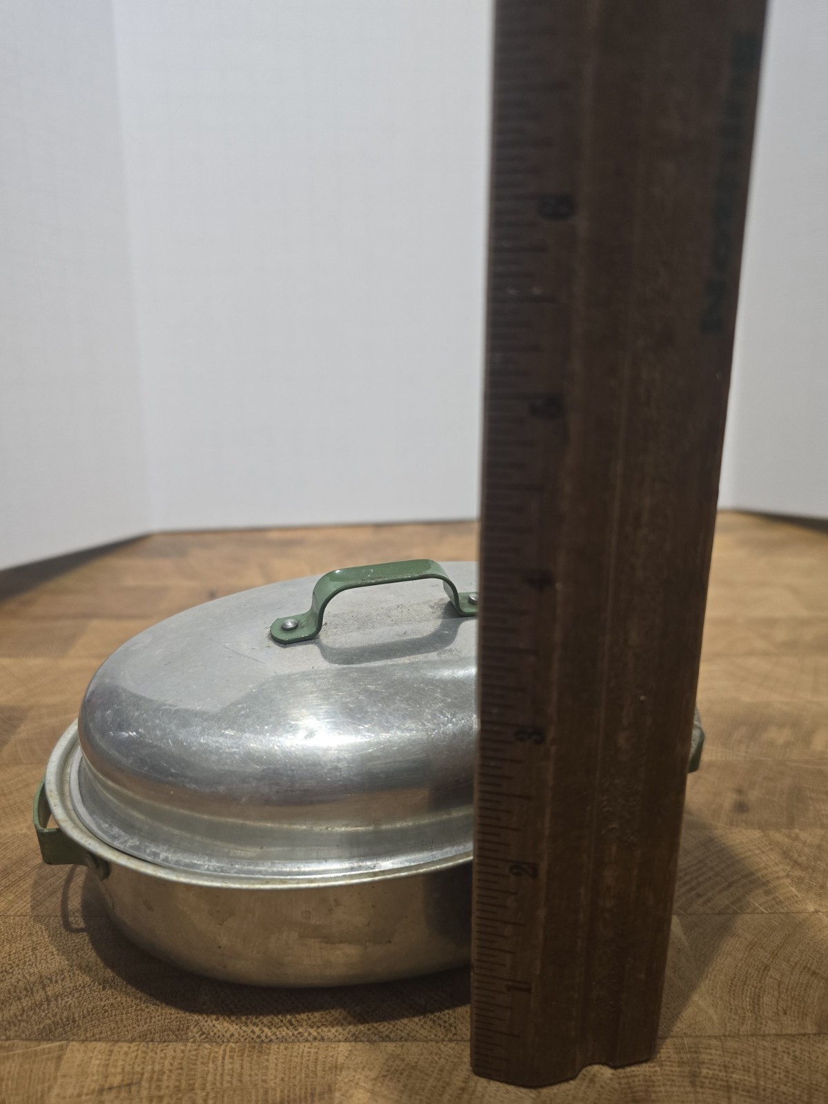 как выглядит Vintage Toy Aluminum Roaster Pan w/ Lid - Approx. 6" - Dents Green Handles фото