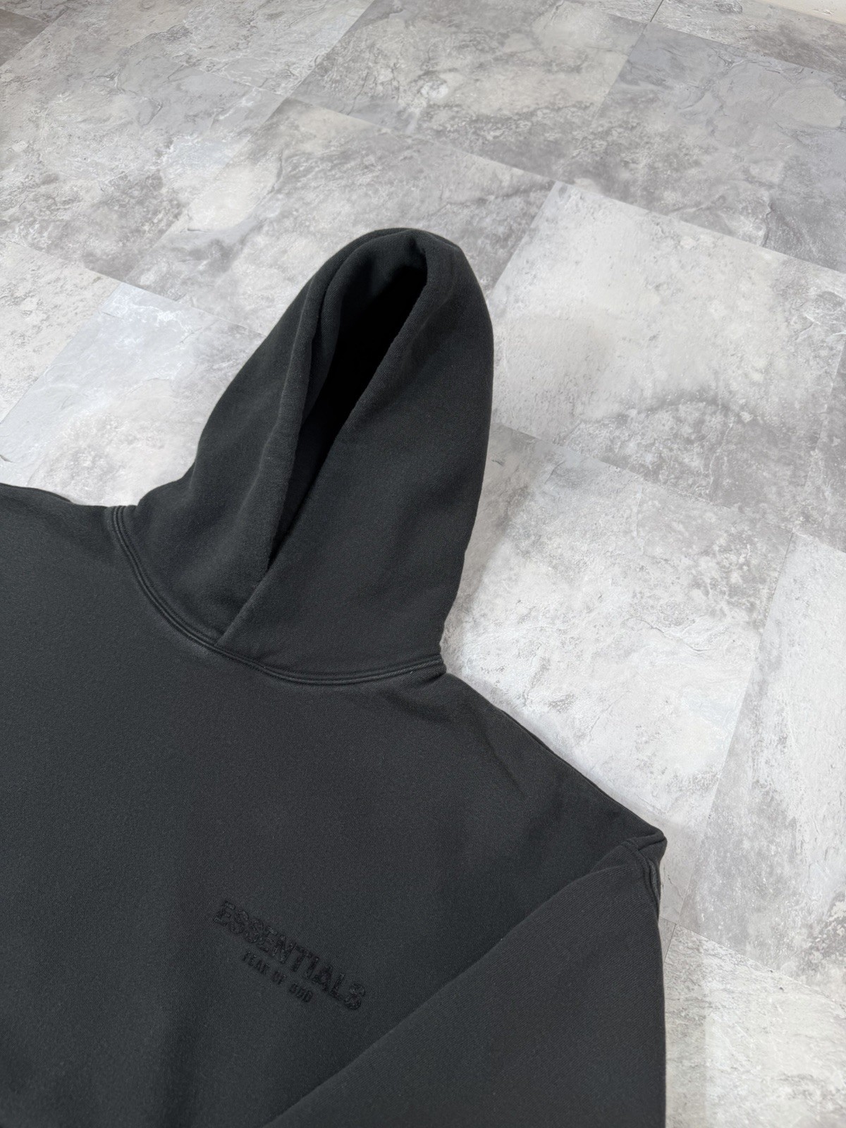 как выглядит Fear of God FOG Essentials Black Stretch Limo Hoodie Velvet Letters Mens Small фото