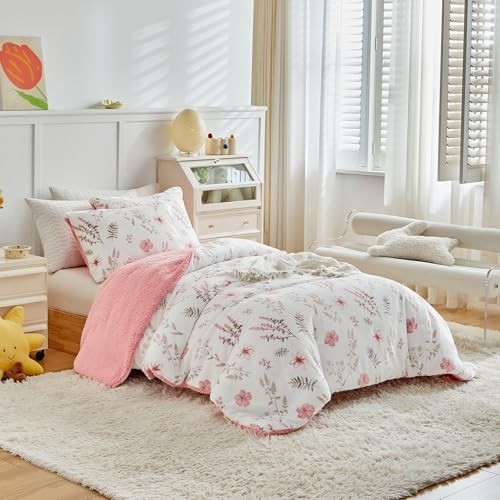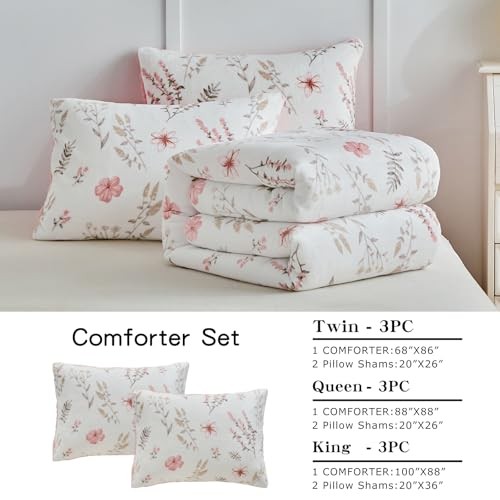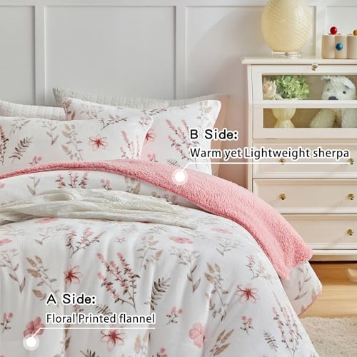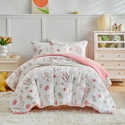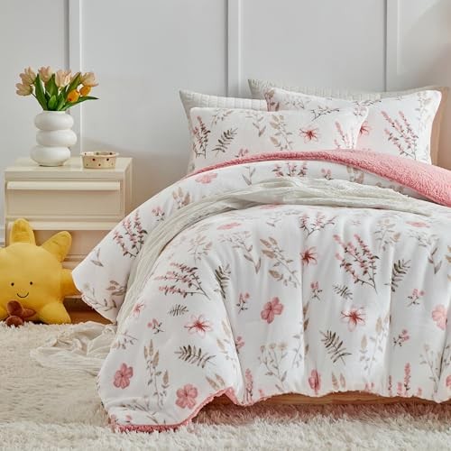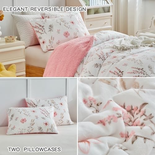 3pcs Flannel Comforter Set for Girls, Queen Size Queen- 88x88 Botanical Pink