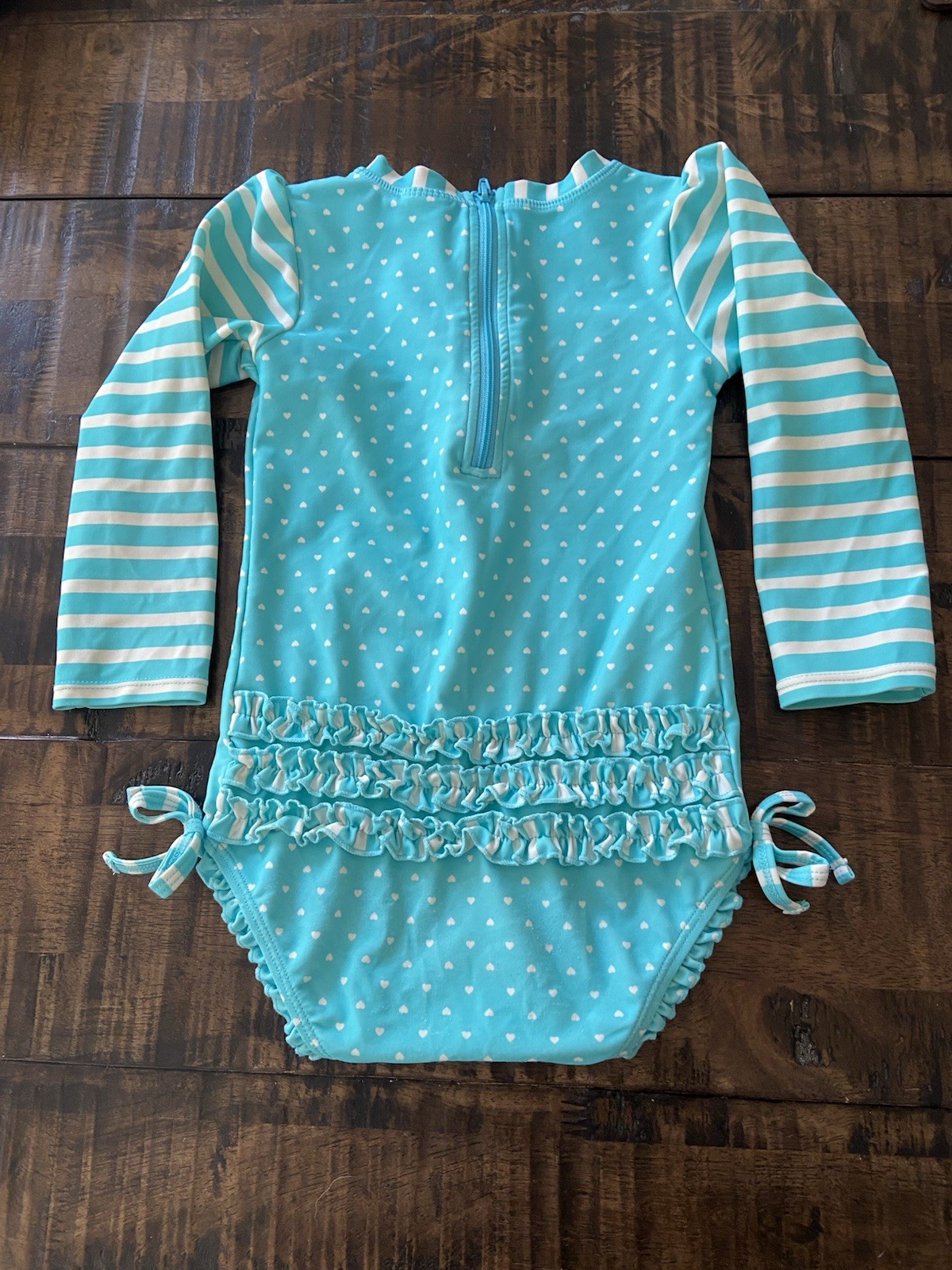 как выглядит Ruffle Butts Aqua Heart Polka Dot One Piece Rash Guard Swimsuit size 3T фото