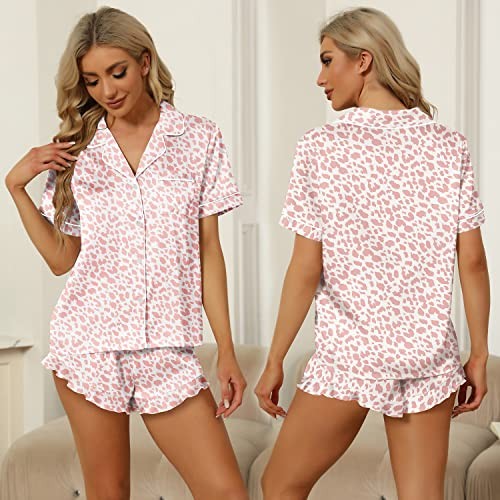 Satin Silk Pajamas for Women 2Pcs Ruffle Notch Collar Medium Pink Leopard