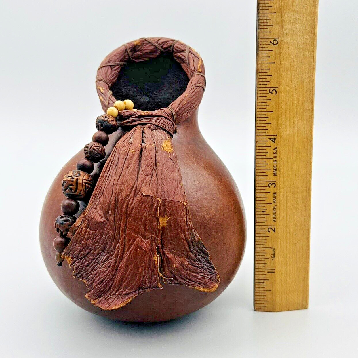 Primitive Genuine Gourd Vase Brown Beaded Accent Fall Decor 6in VTG Handmade
