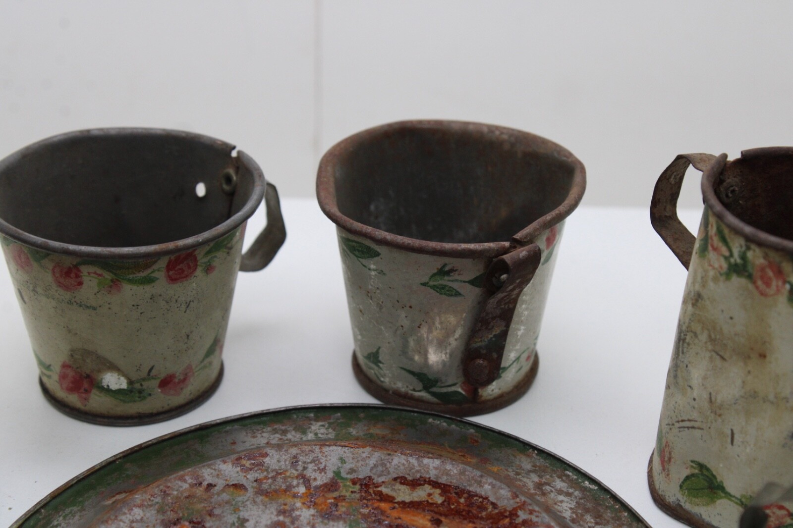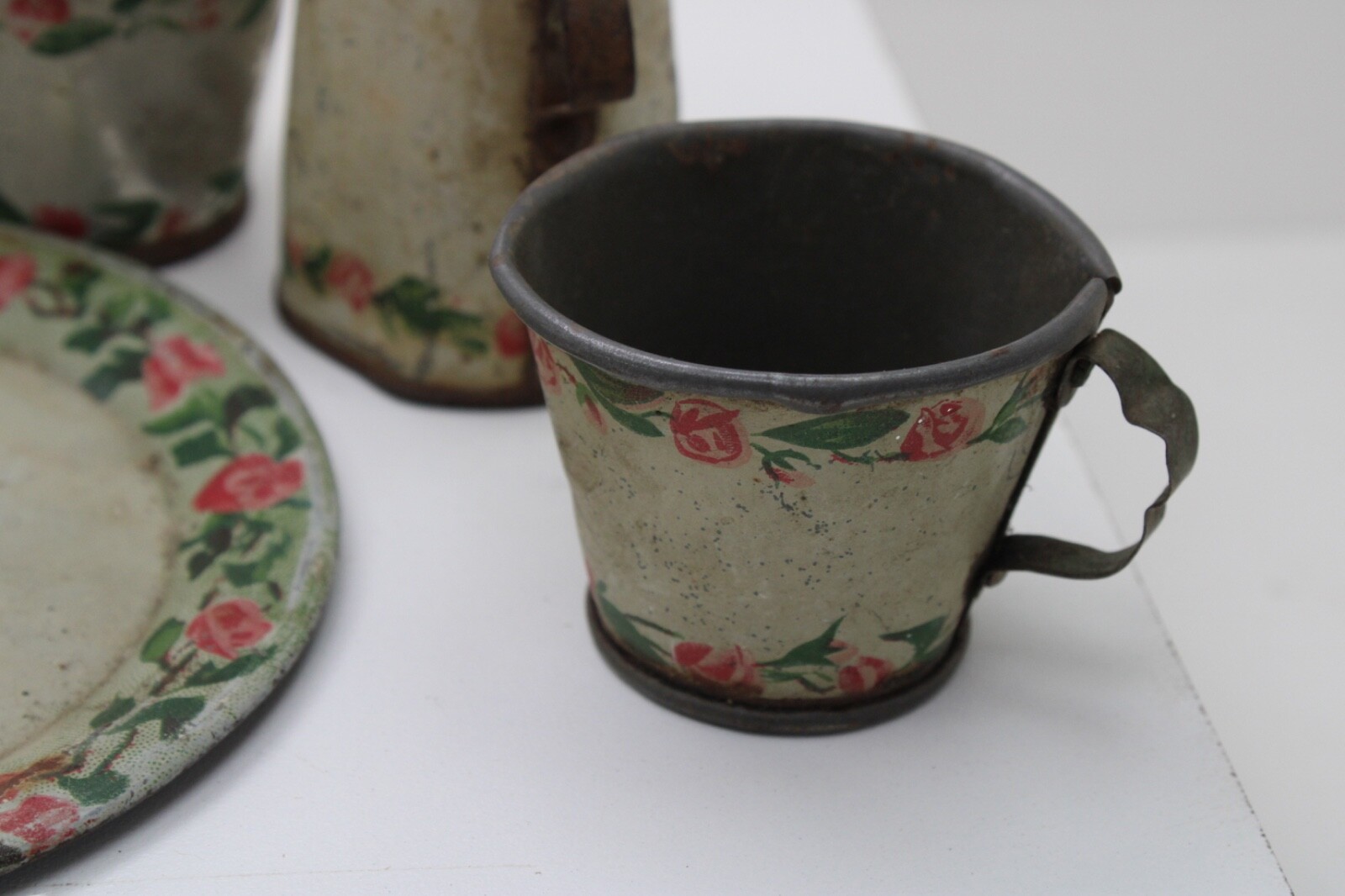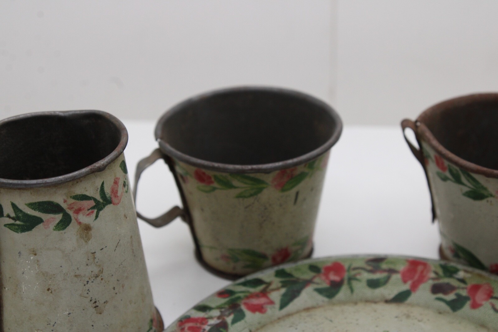 как выглядит Vintage Ohio Art Play Tin Dishes 5 Pieces Plate Cups Pitcher Pink Roses USA фото