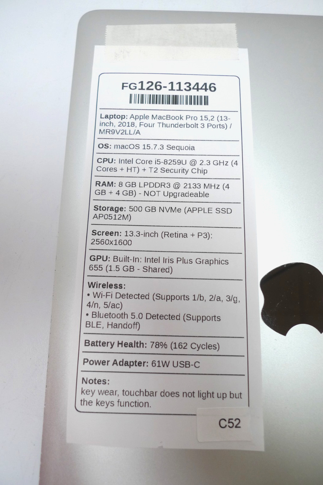 MacBook Pro 13 2018 i5-8259U 8GB RAM 512GB NVMe 162 Cycles/Bad Touchbar