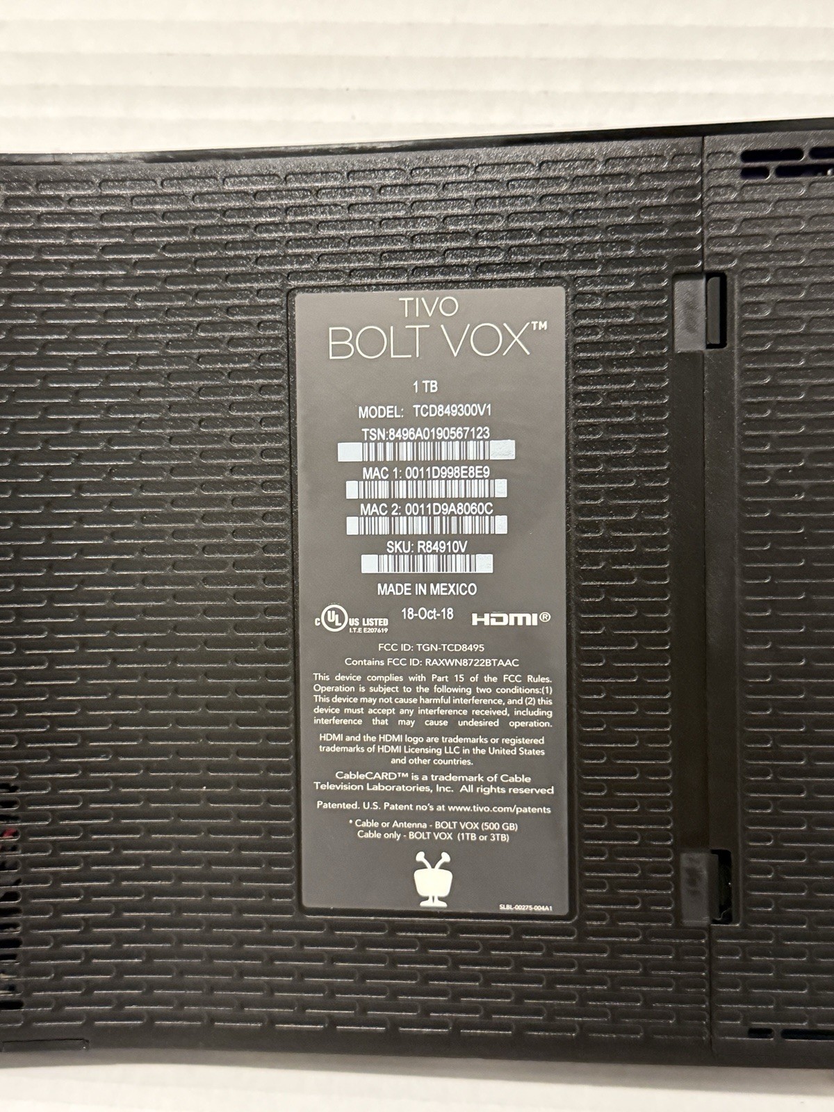 TiVo BOLT VOX 1TB HDD 4K DVR Model TCD849300V1/Sold as is