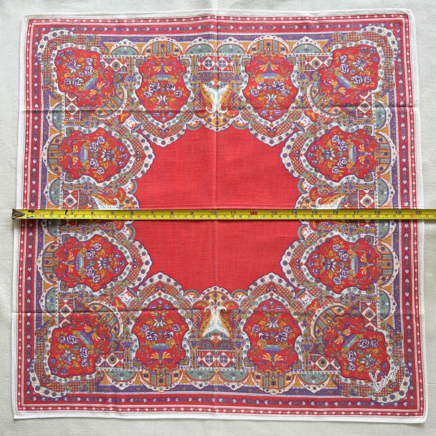 Vintage Handkerchief Red Cotton Border Folklore Damask Pattern Pocket Square 20