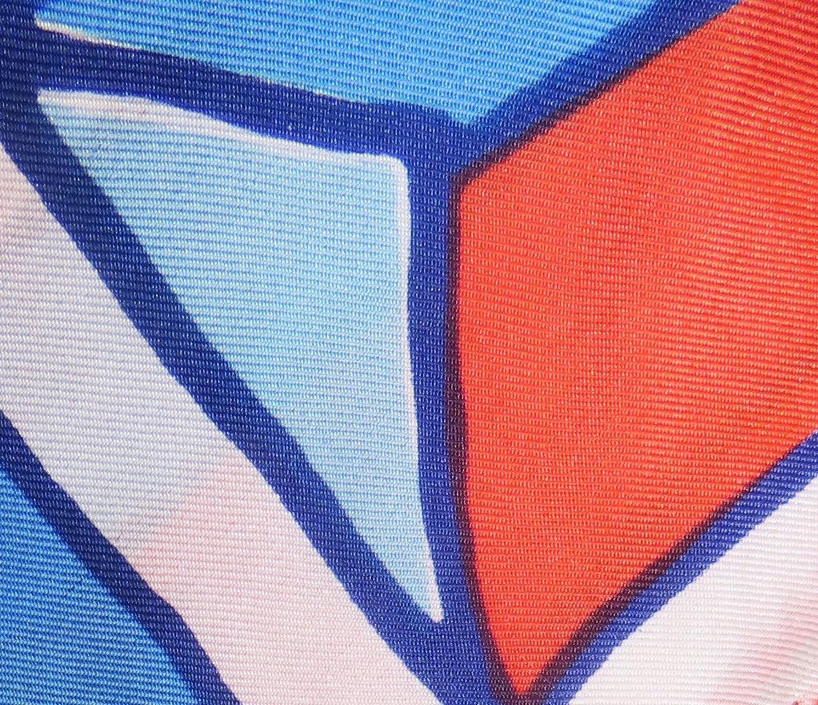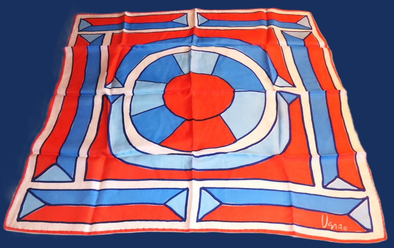 Vera Neumann square geometric scarf; orangey-red, blue tones, white; 22.5x22.5