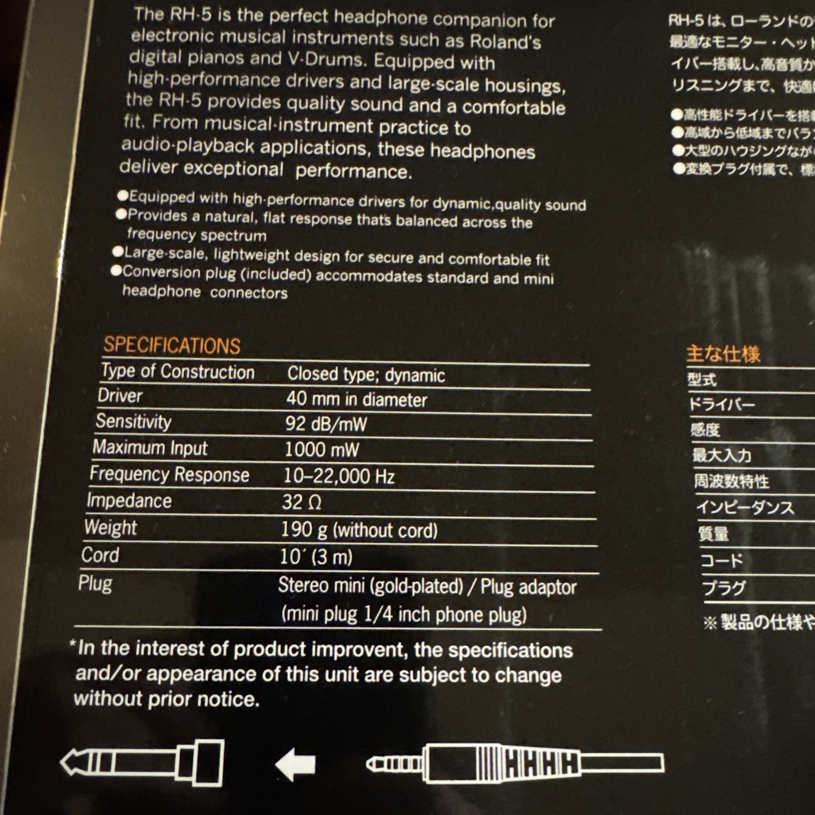 Roland RH-5 Monitor Stereo Headphones With Conversion Stereo Plug Adapter NEW