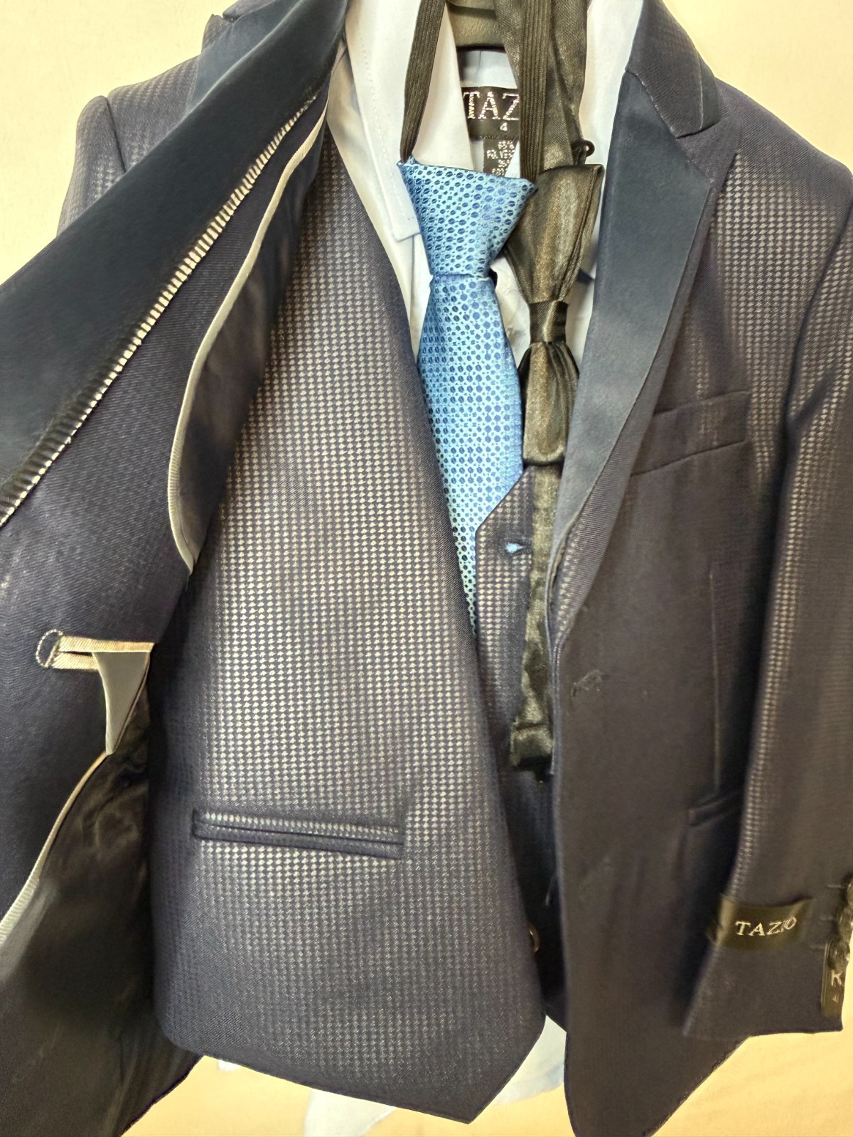 как выглядит Tazio Boys Navy Blue Textured Formal 5 Piece With Bow Tuxedo Suit Set Size 4 фото