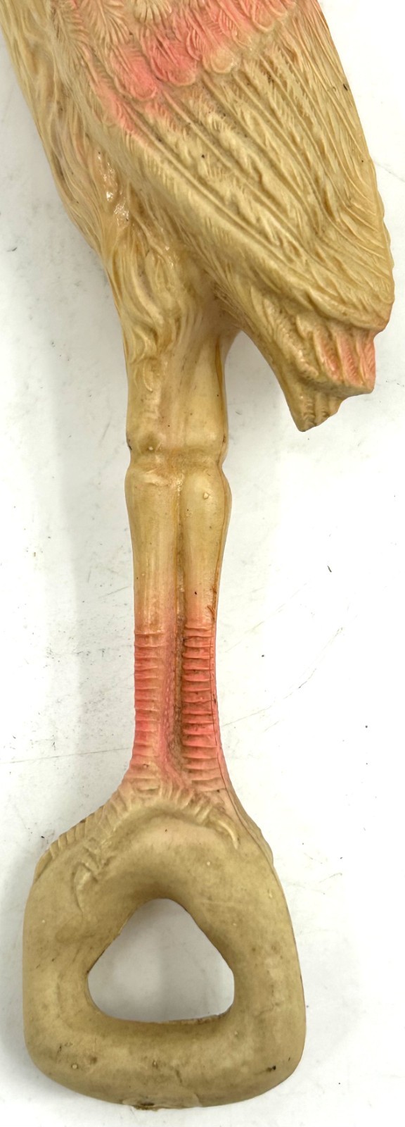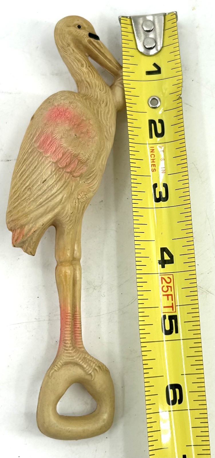 как выглядит Vintage 1940s Celluloid Baby Rattle Toy 3D Stork with Baby Bundle фото