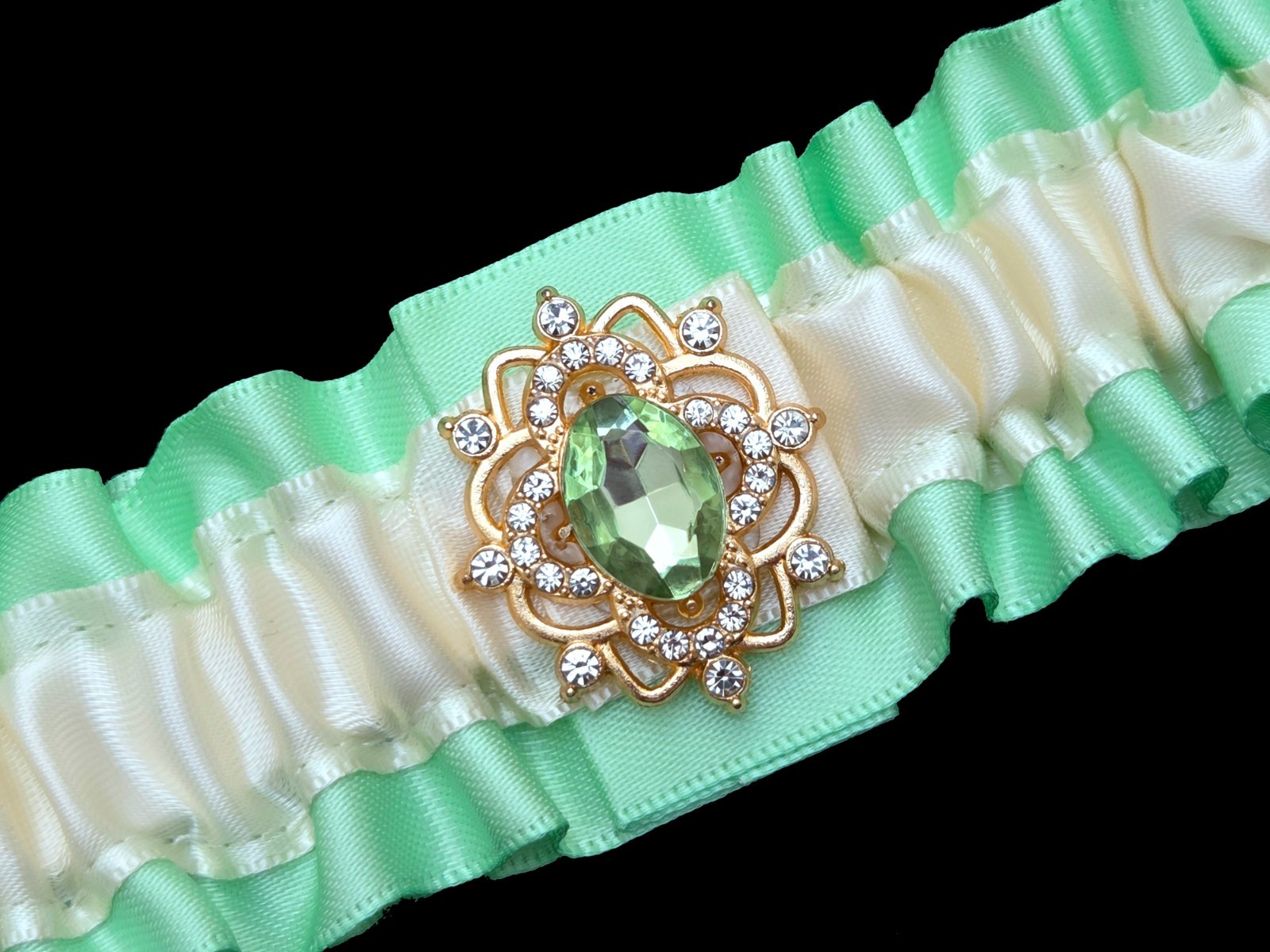 Wedding Garter Mint Green Ivory Satin Bridal Prom Rhinestones Gold Toss Handmade