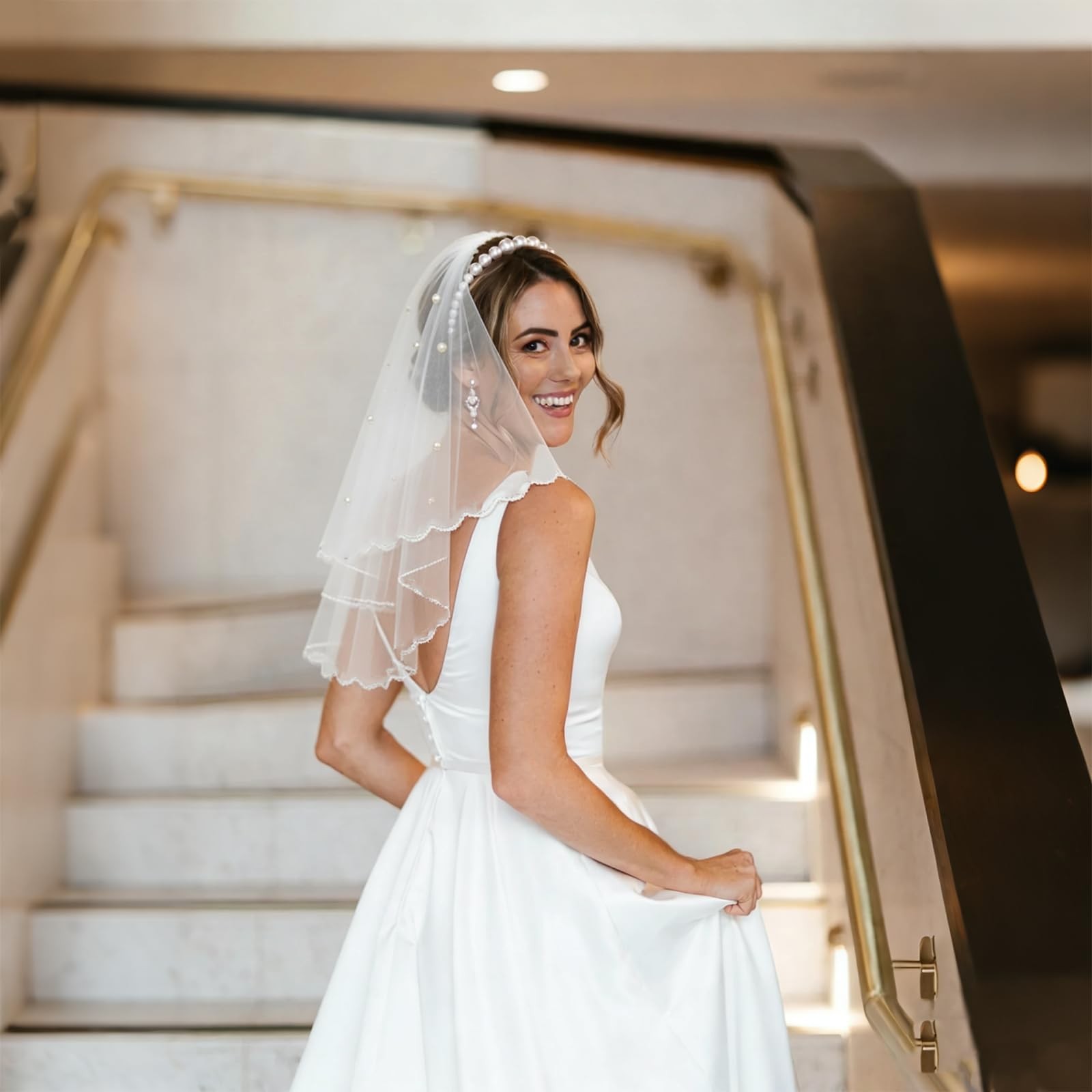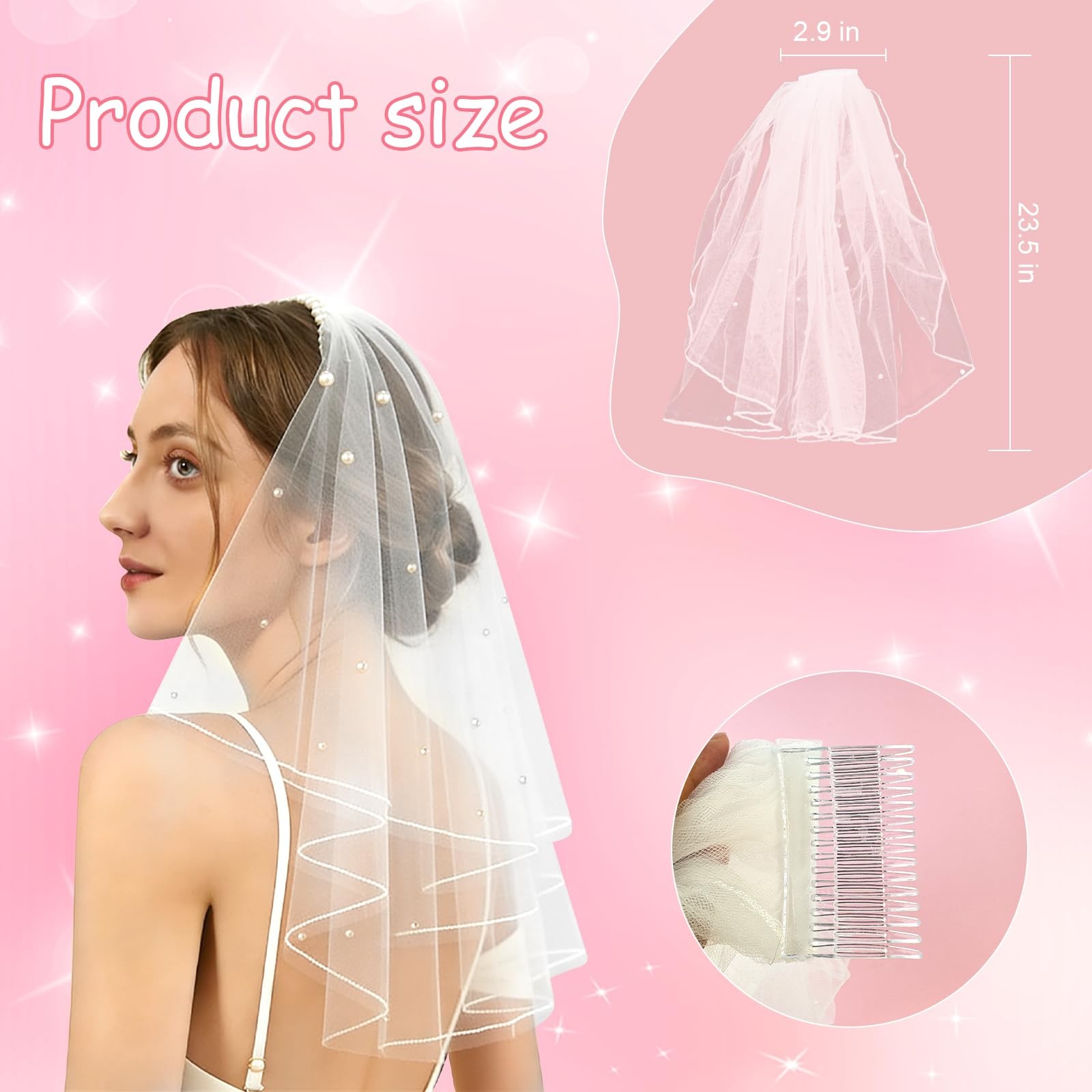 White Short Wedding Veil Bridal Bachelorette Pearl Rhinestone Bride To Be