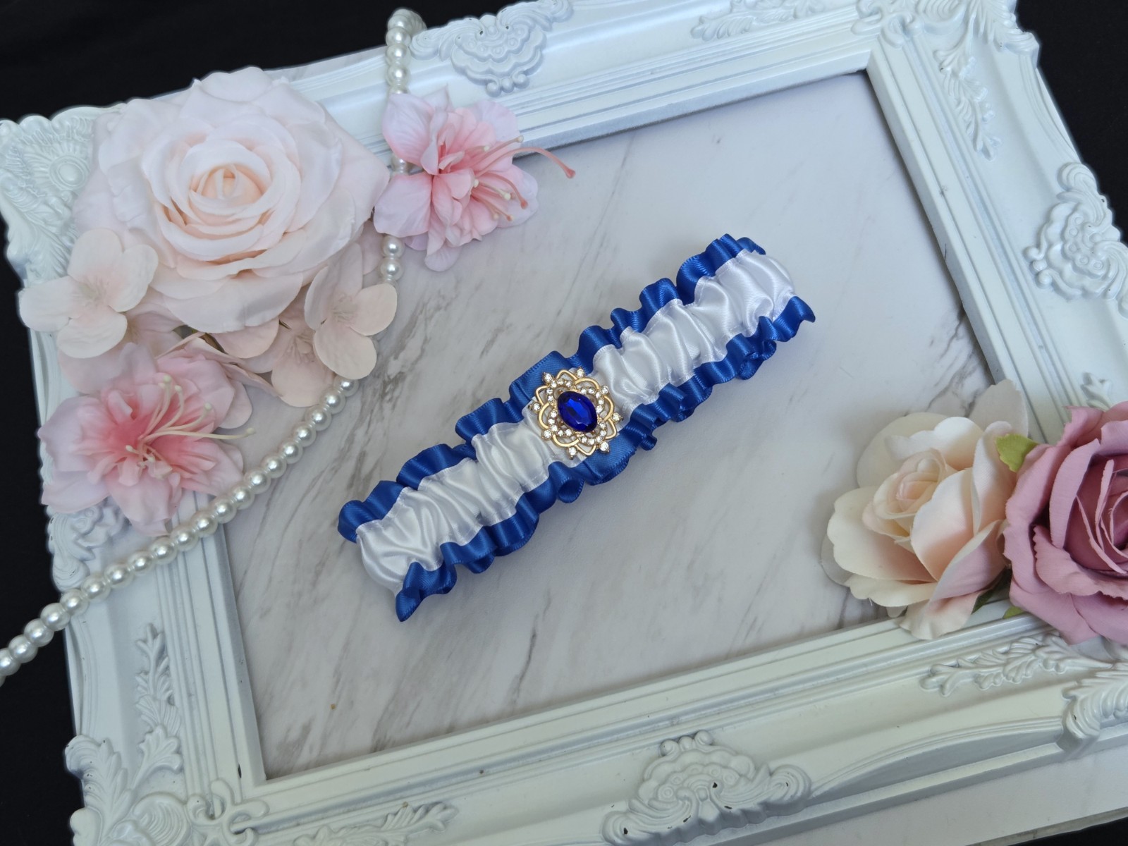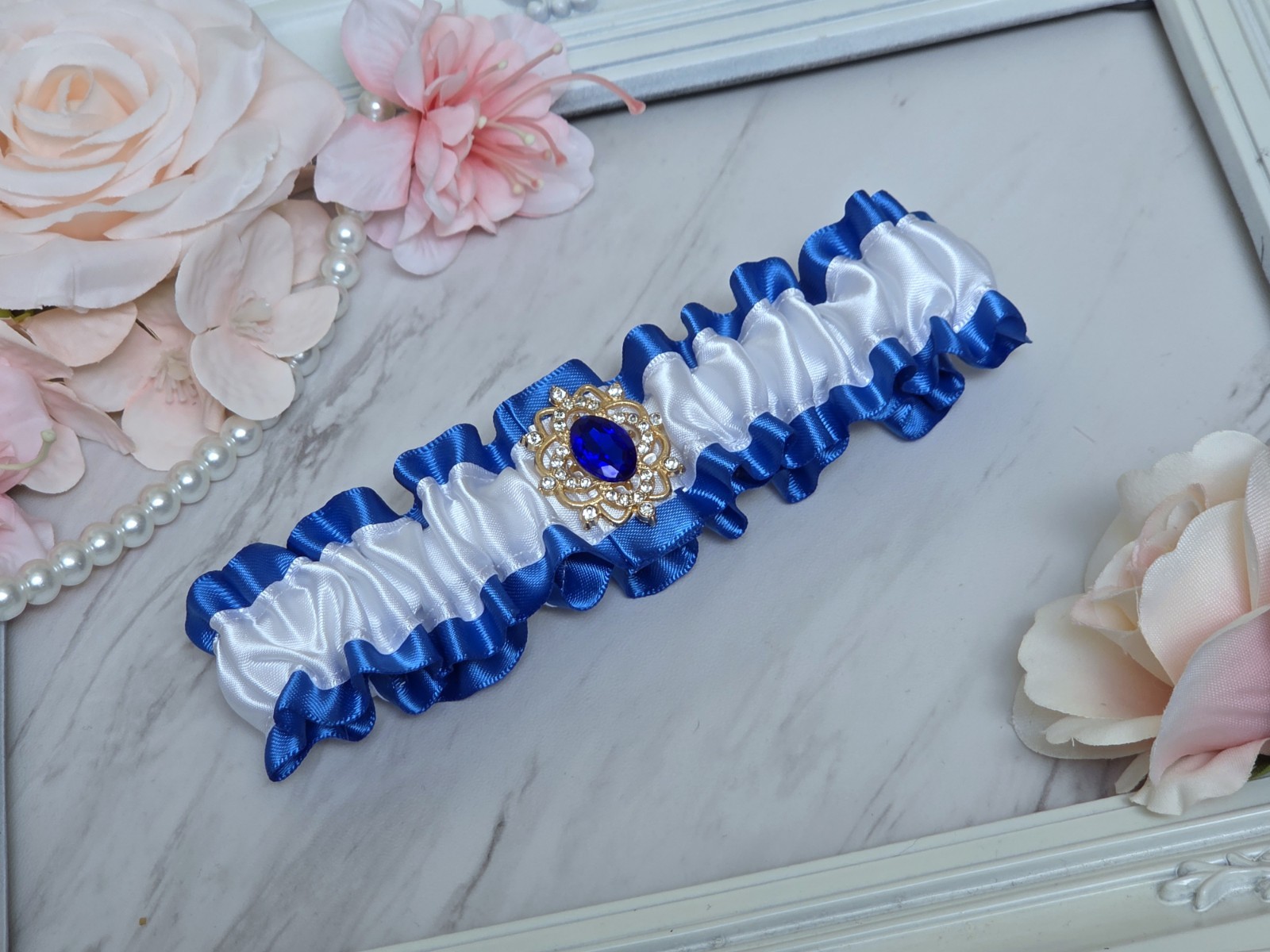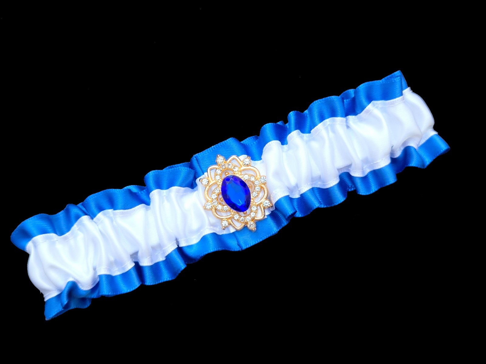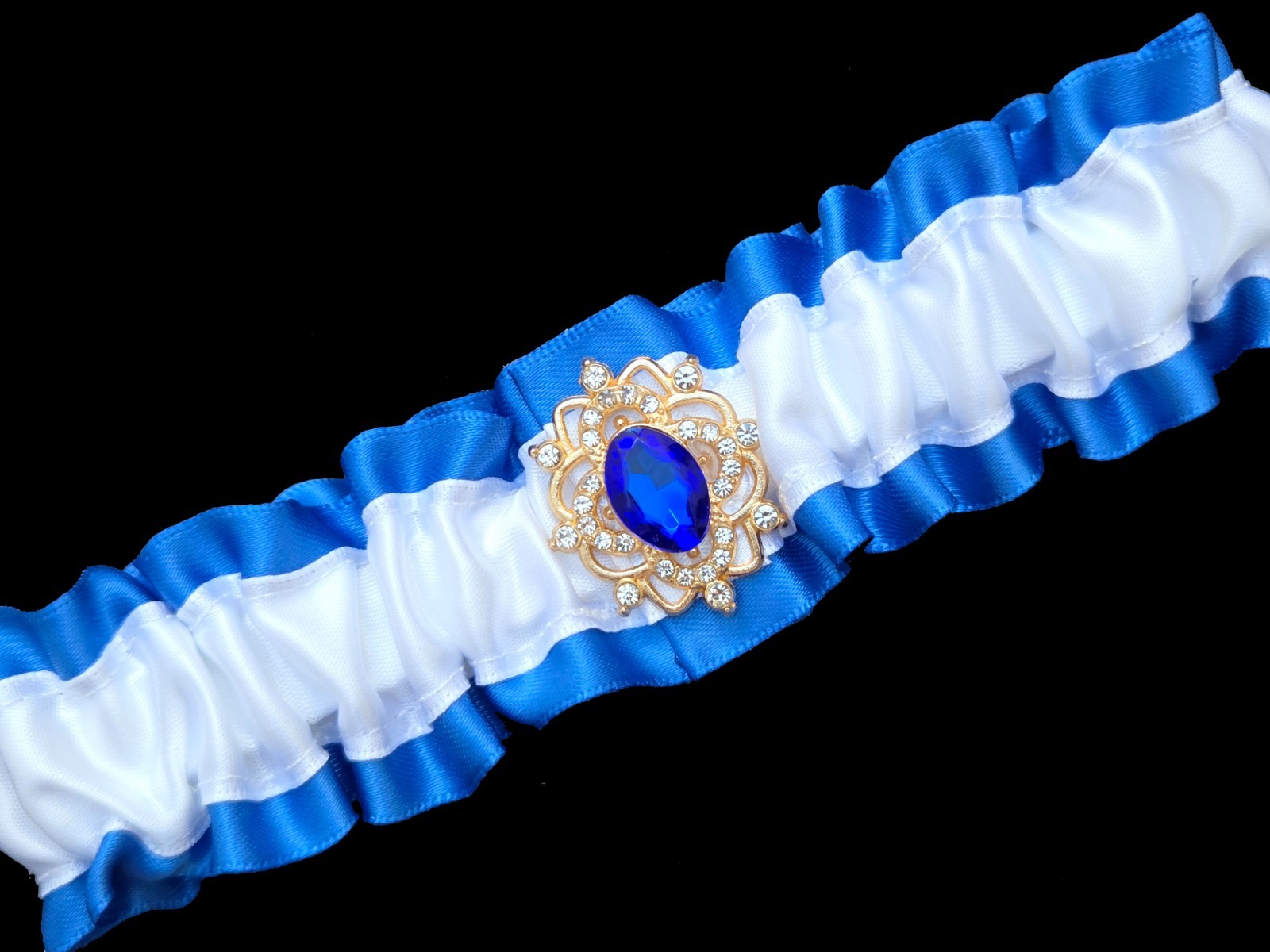 Wedding Garter Royal Blue Bridal Prom Satin Something Blue Rhinestones Gold Toss