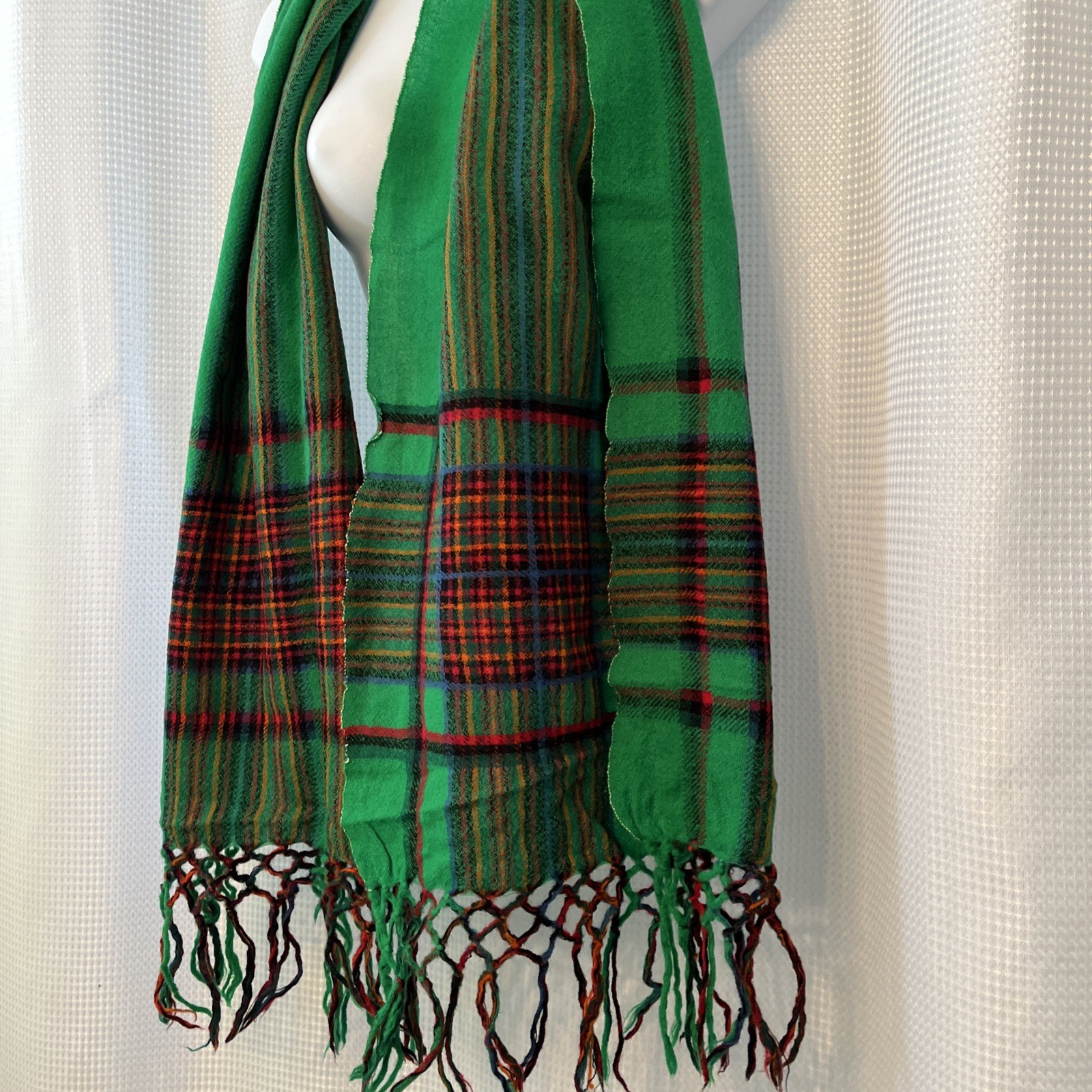 Vintage Kelly Green Plaid Scarf 18x68 fringe red orange multi color