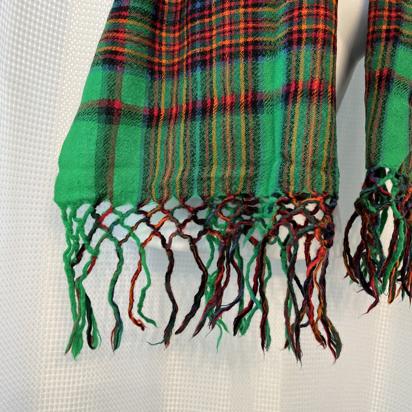 как выглядит Vintage Kelly Green Plaid Scarf 18x68 fringe red orange multi color фото
