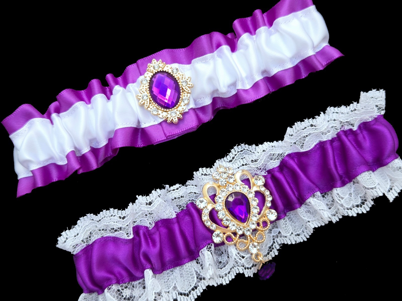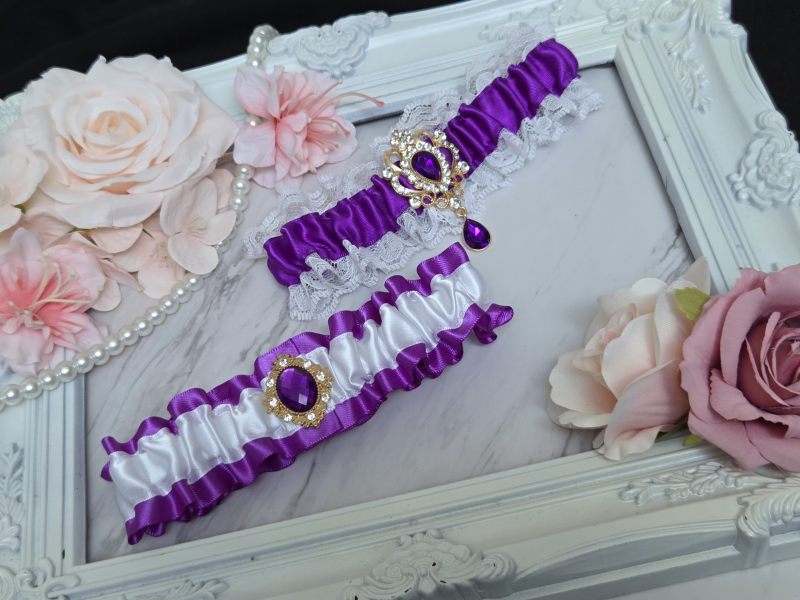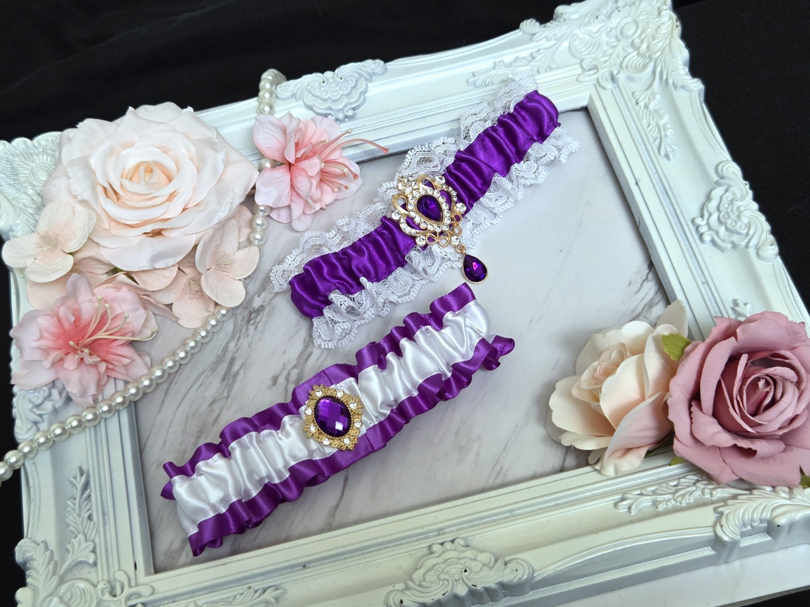 Wedding Garter Set Purple White Satin Lace Prom Bridal Accessories Rhinestones