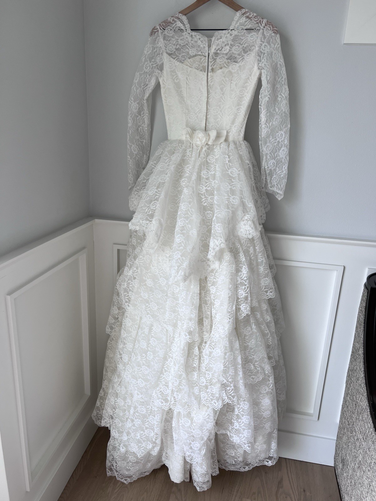как выглядит Vintage Floral Lace Tiered White Puff Wedding Gown Dress Size S- XS фото
