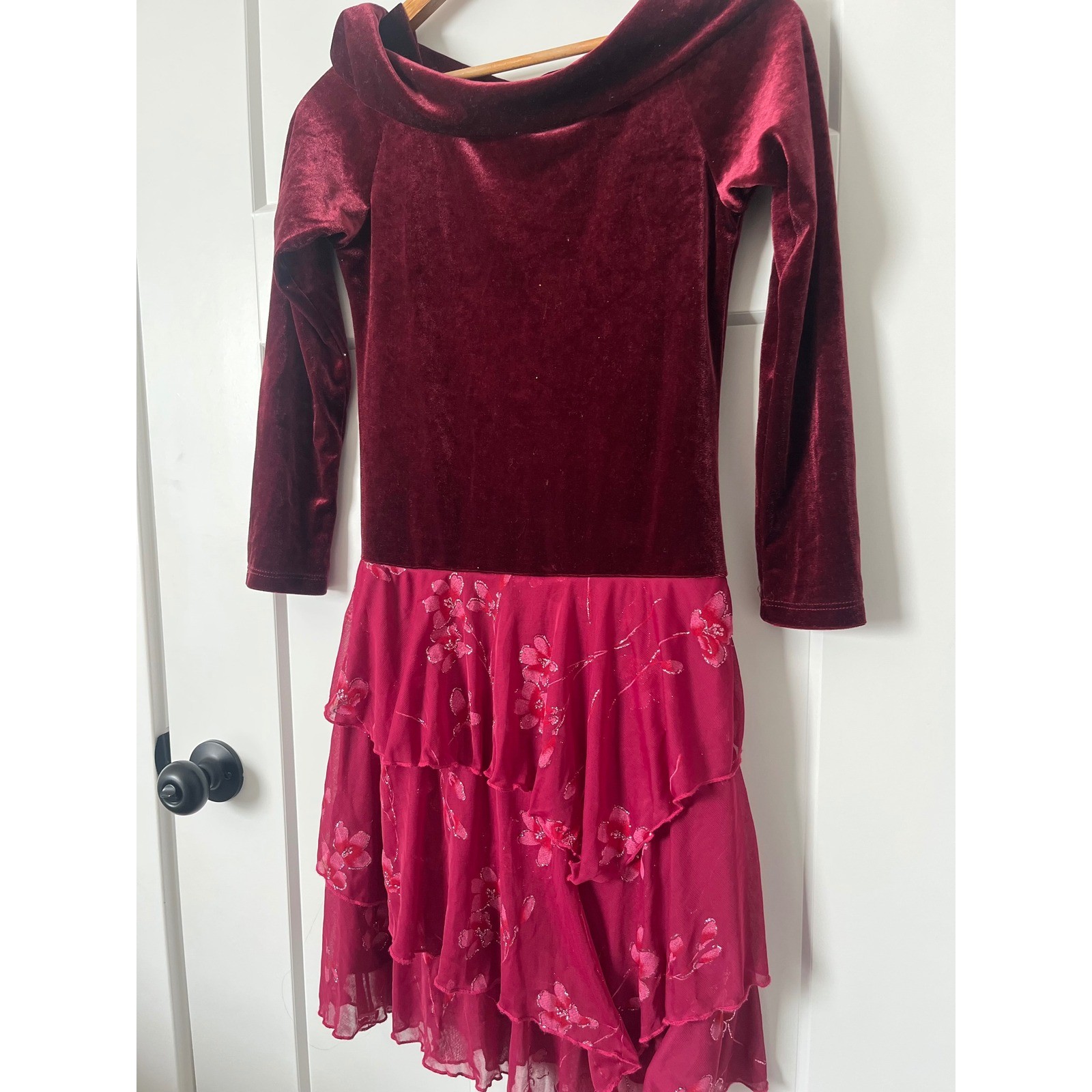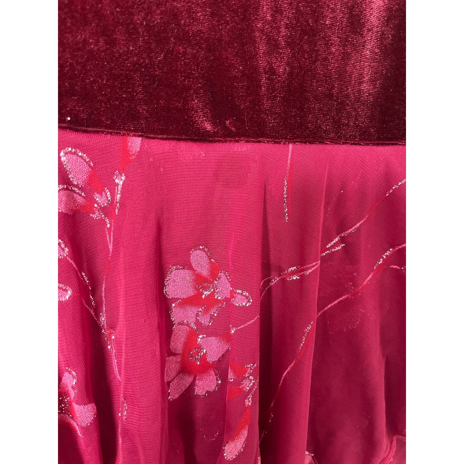 как выглядит Wrap Around Girls Burgundy Velvet Pink Floral Tiered Glitter Party Dress Size 12 фото