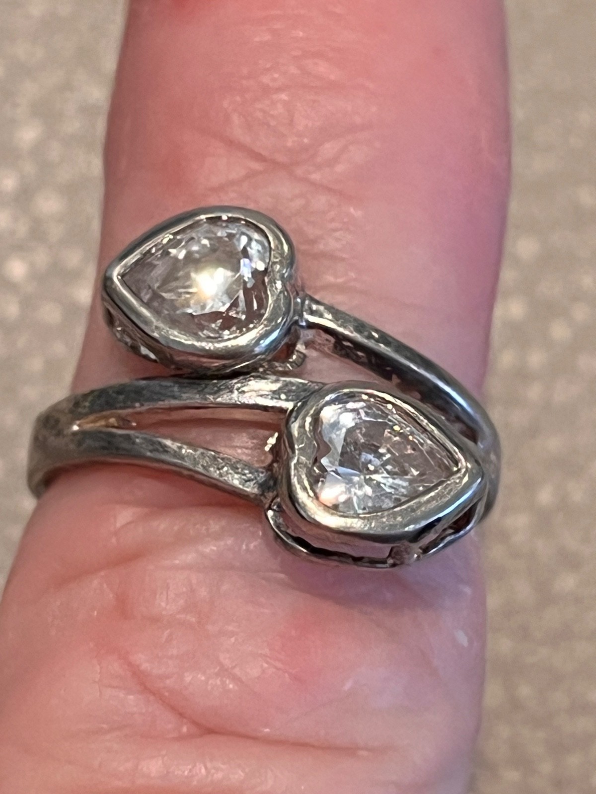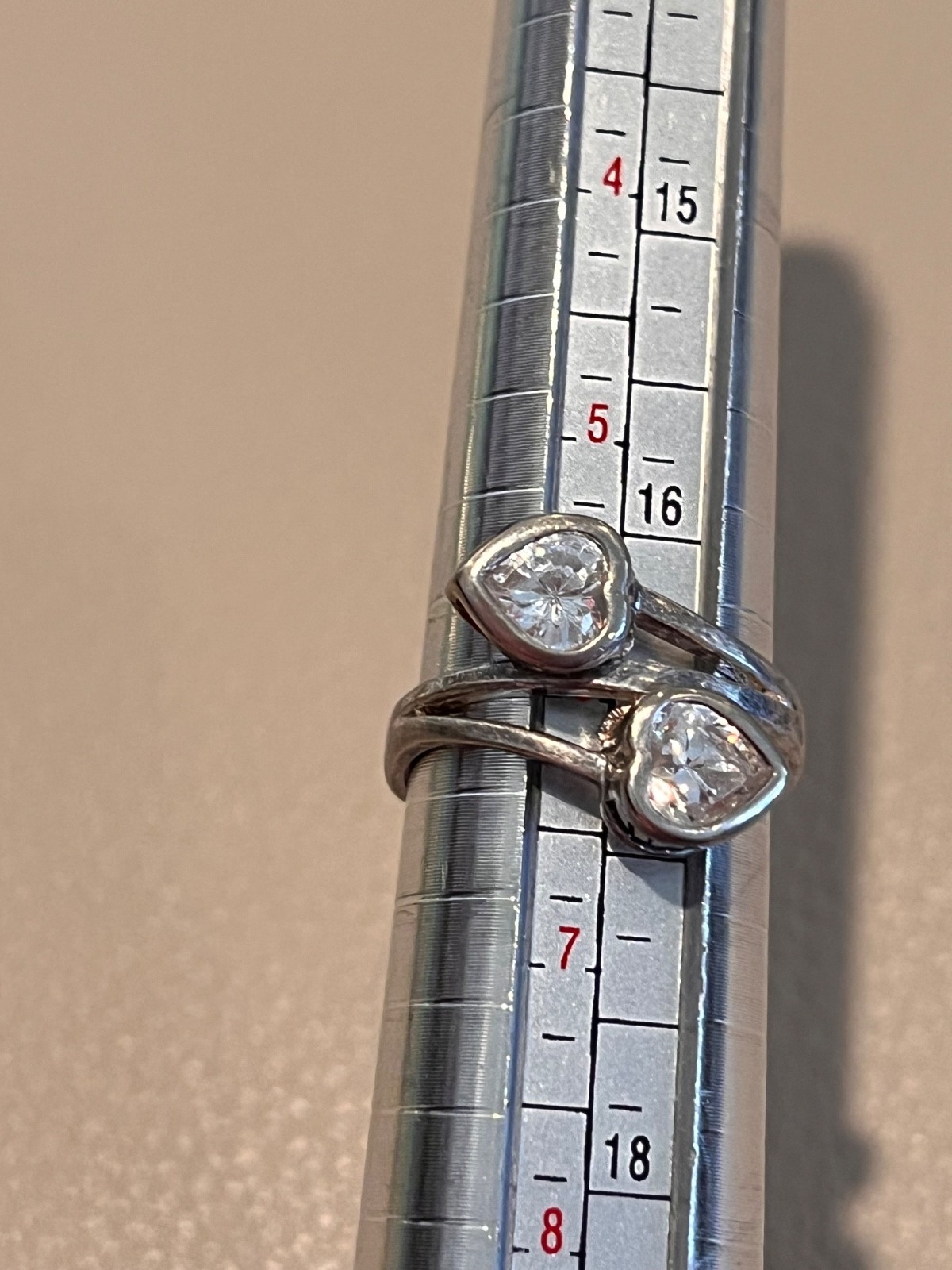 как выглядит Vintage Sterling Silver Double Heart CZ Cubic Zirconia Ring - size 6 фото