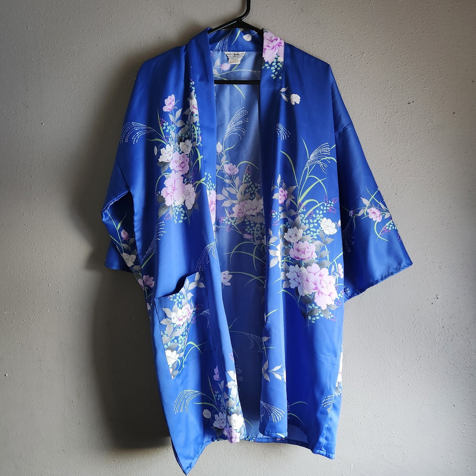 • Vintage Japanese Kimono Robe Blue Floral Japan Made Silky 1 Size Artsy Festival