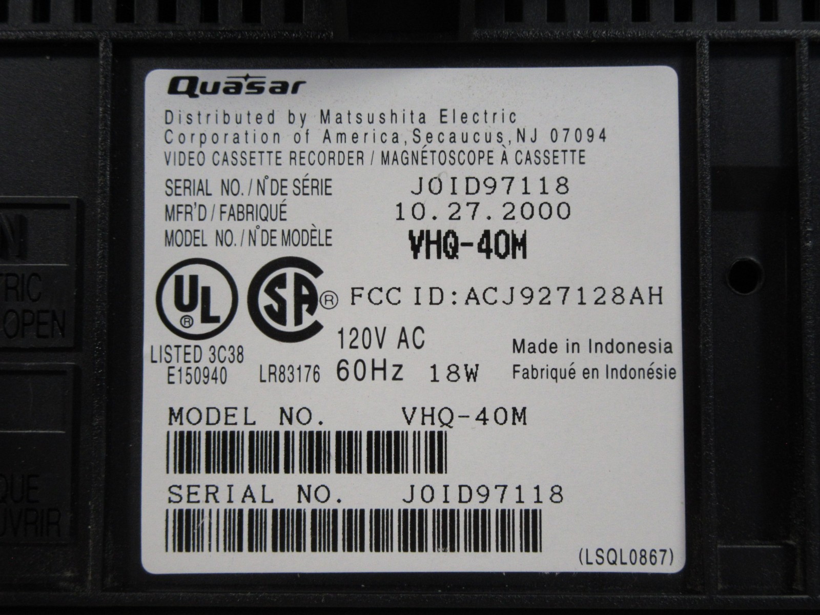 Quasar VHQ-40M 4 Head Omnivision VCR with Remote Serviced and Tested