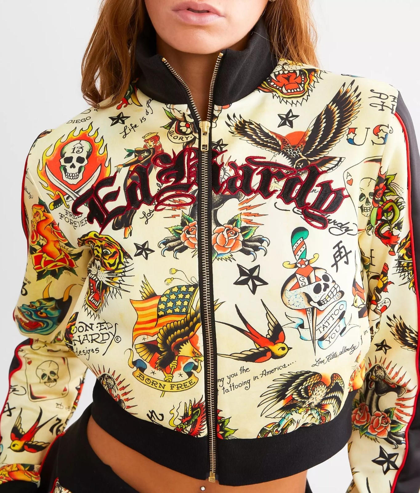 NWT Ed Hardy Cropped Track Jacket Womens XL Shrunken Flashboard Multi