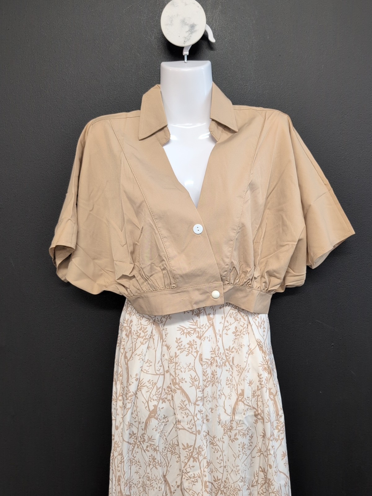 как выглядит Short Sleeve Collared Pleated Cropped Top Wide Leg Pants 2Pcs Set Small Beige фото