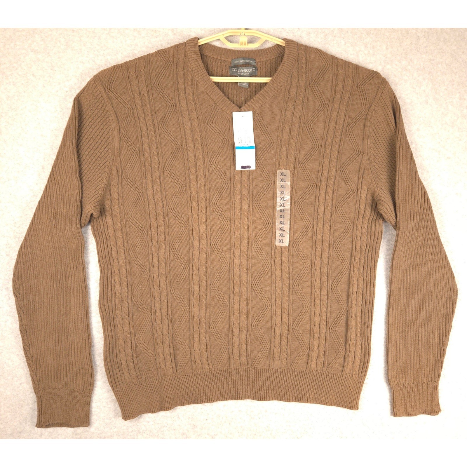 Lyle Scott Scotland Men's Brown Cable Knit V Neck Sweater XL 100 Cotton