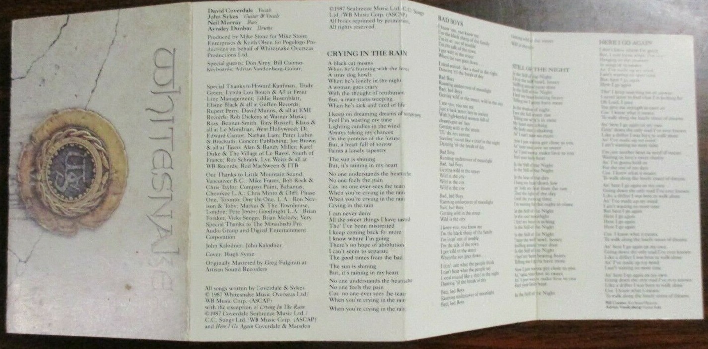 Whitesnake Cassette with Insert, 1987, Geffen, Excellent Condition