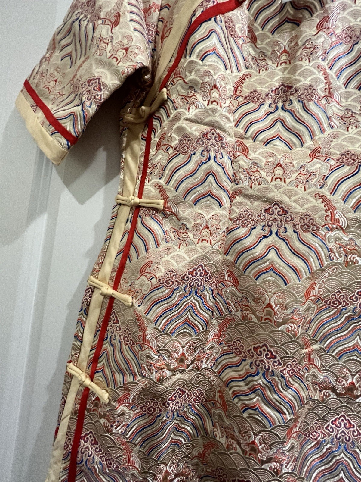 New Chinese Brocade Qipao Dress Cream Red Blue Wave Pattern Cheongsam US S/M