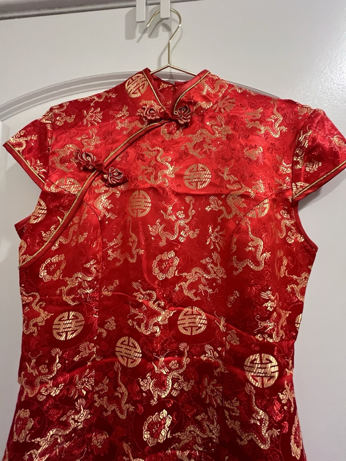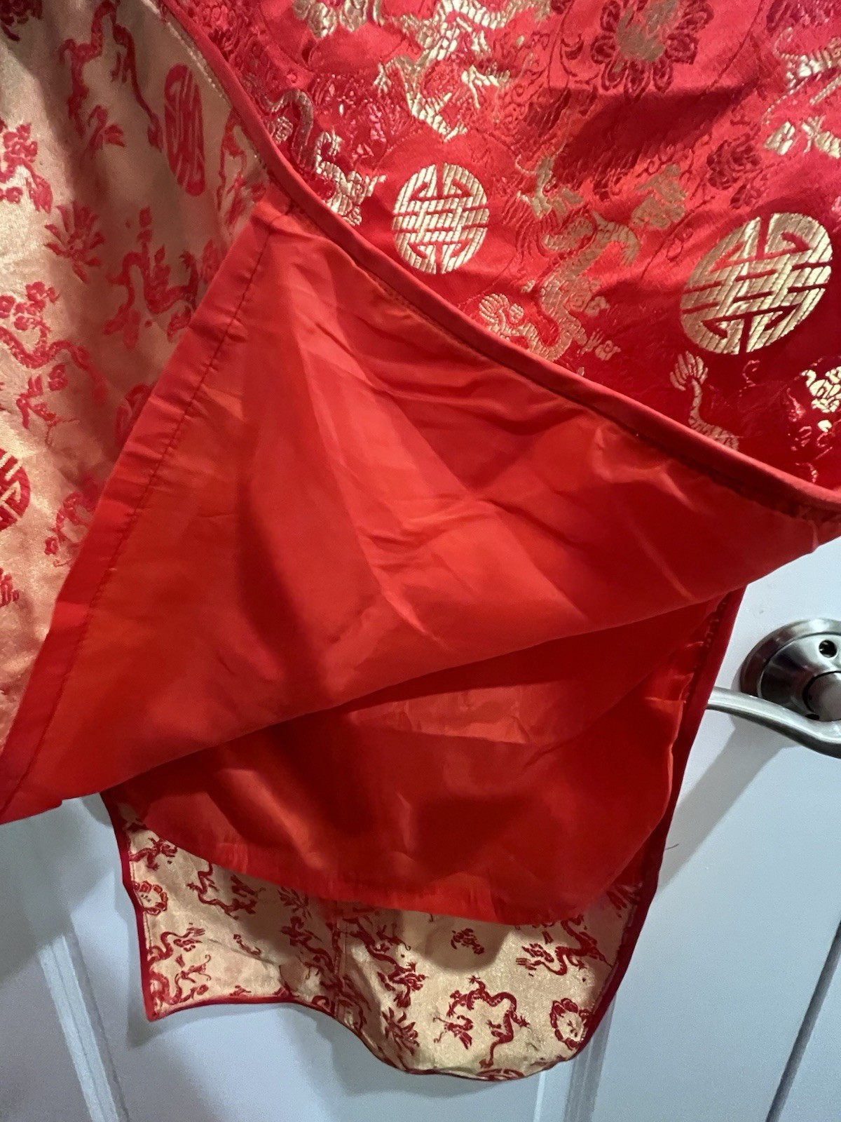 Red Gold Brocade Cheongsam US M Satin Lined Dragon Longevity Wedding Qipao Dress