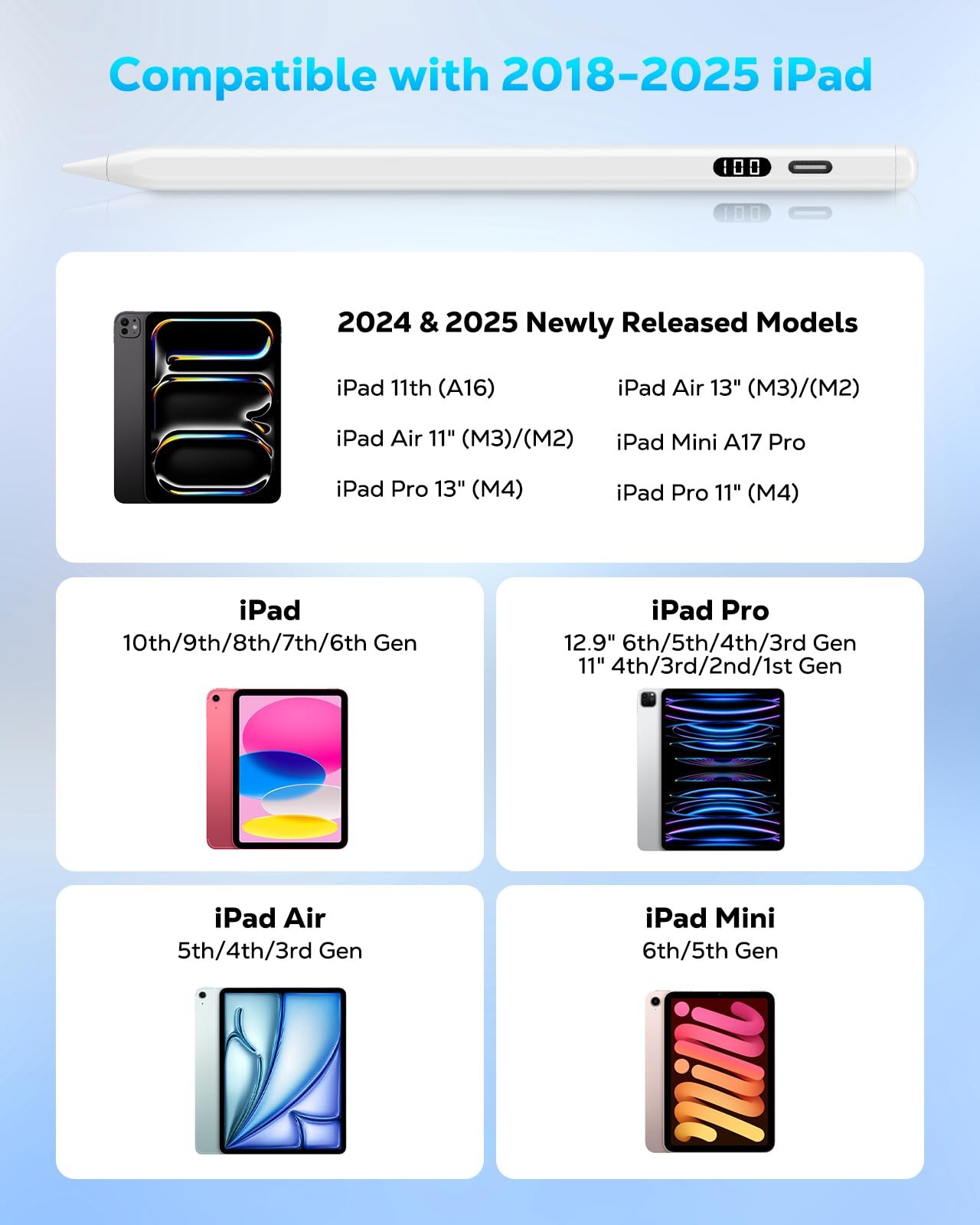 MoKo Stylus Pen for iPad 2018-2025, USB-C Fast Charging Pencil with LED White