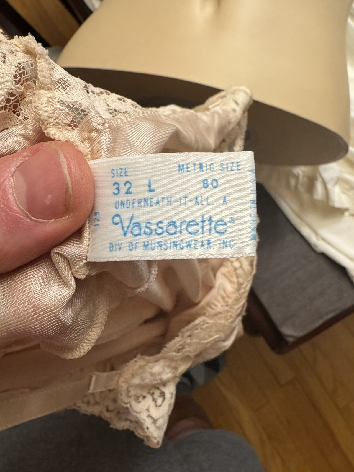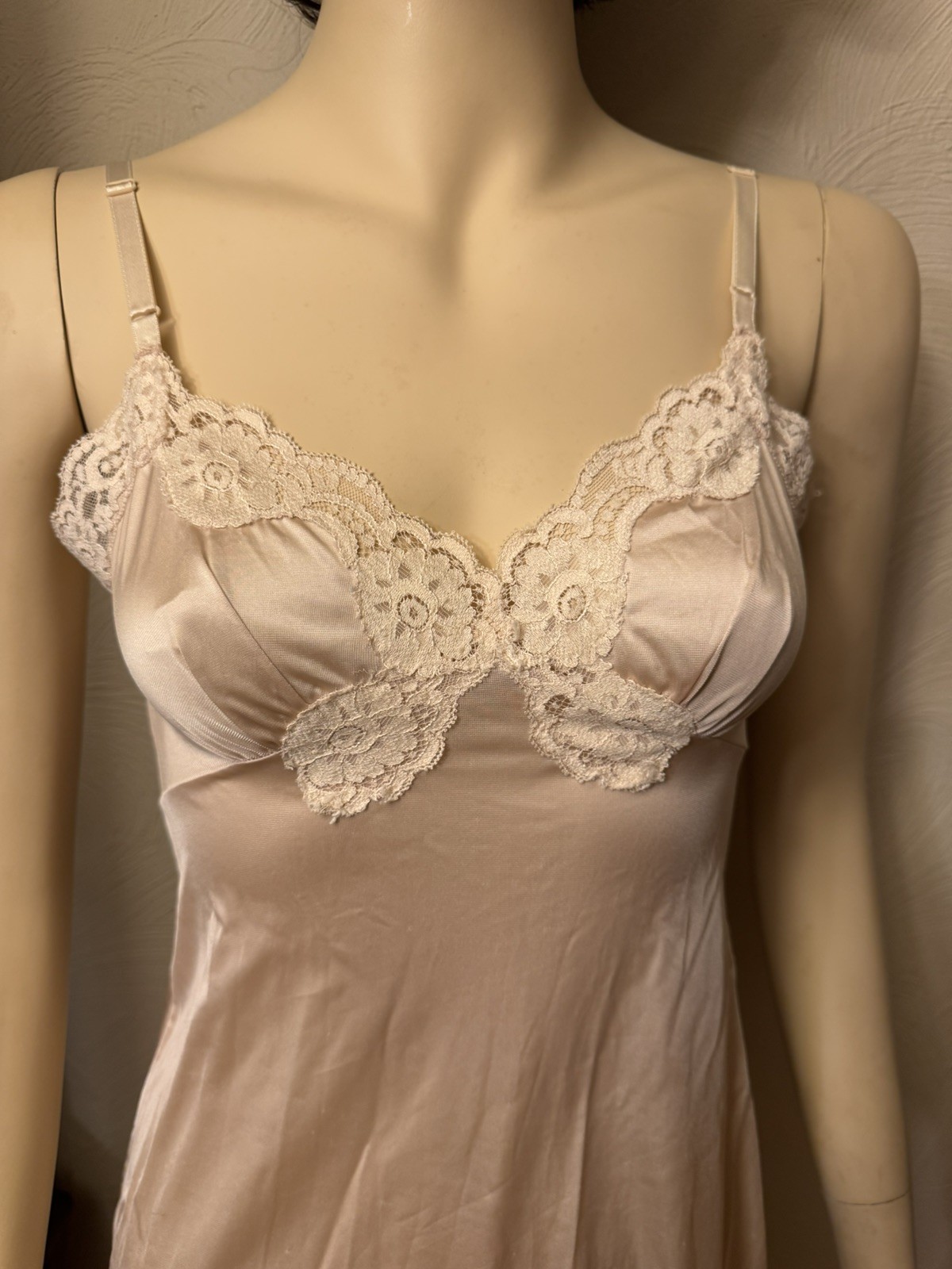 как выглядит vtg 70s VASSARETTE BEIGE NYLON LACE BUST full slip nightgown size 32 L фото