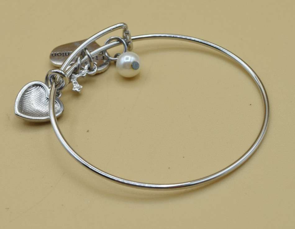 First Communion Bangle Bracelet Stainless Silver Toned Charms Cross, Heart Pearl