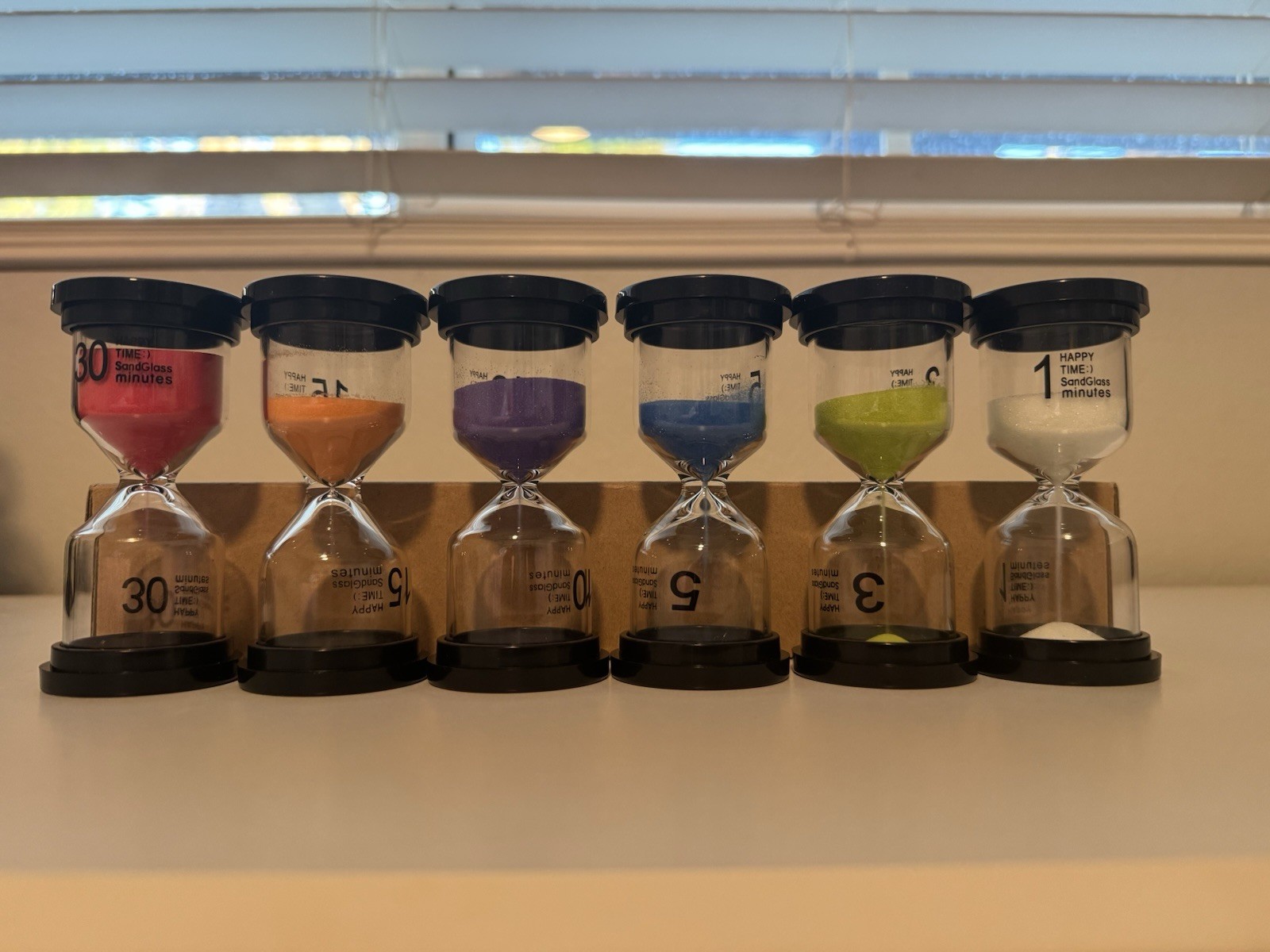 Happy Time Sand Glass Timers 6 Colors Hourglass 30-15-10-5-3-1 New In Box