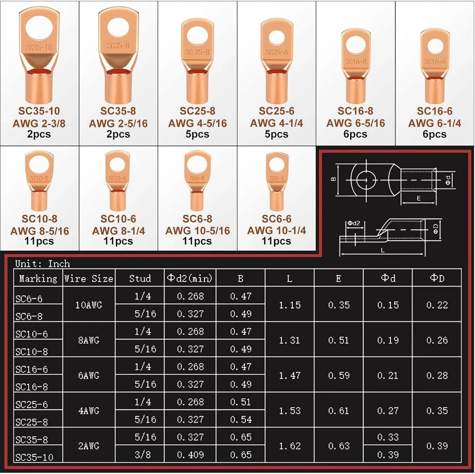 Copper Battery Cable Ends Wire Lugs Assortment Kit AWG 2 4 6 8 10 Gauge 150pcs