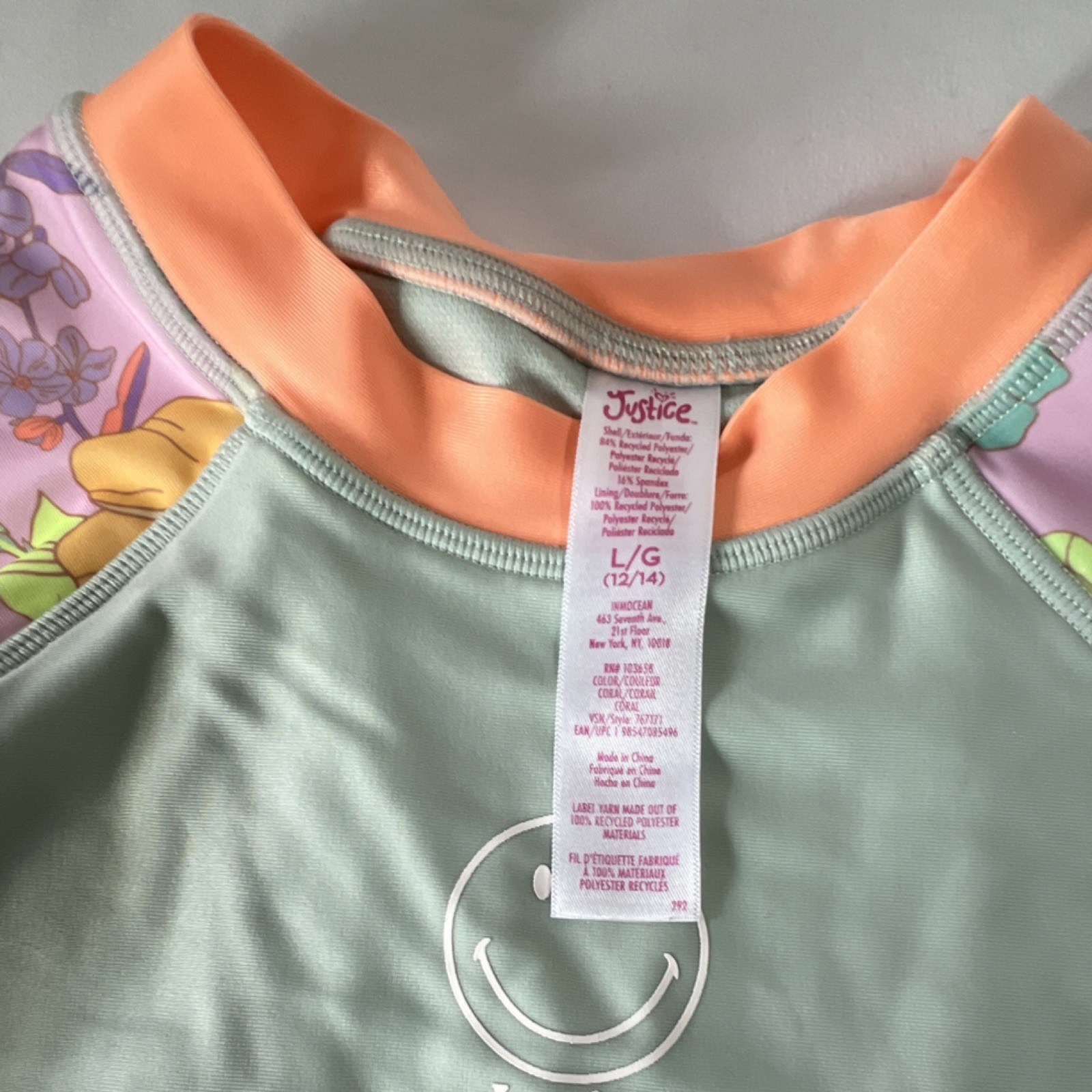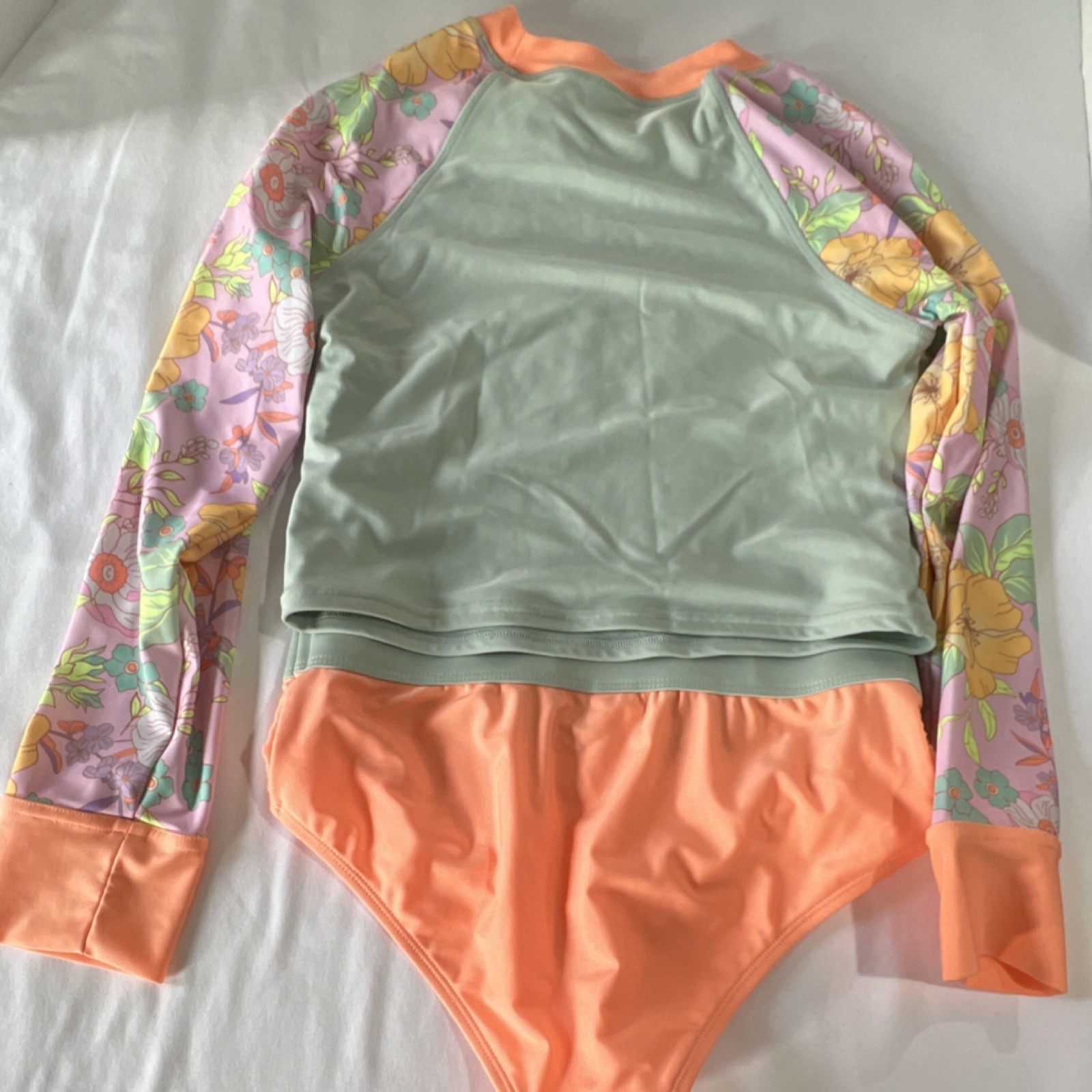 как выглядит Justice Girls 2-Piece Swim Set Floral Long Sleeve Peach Mint L/G 12/14 фото