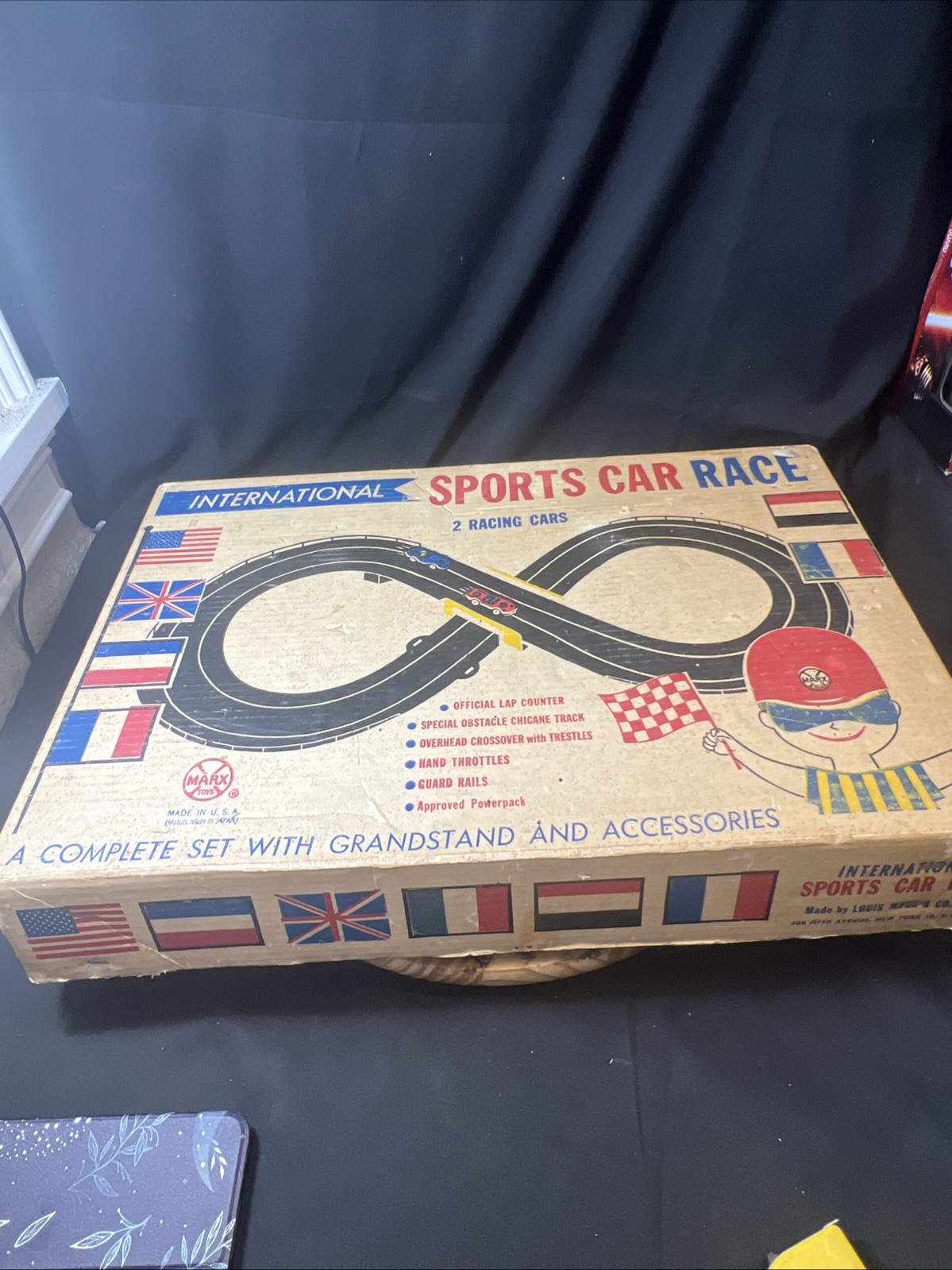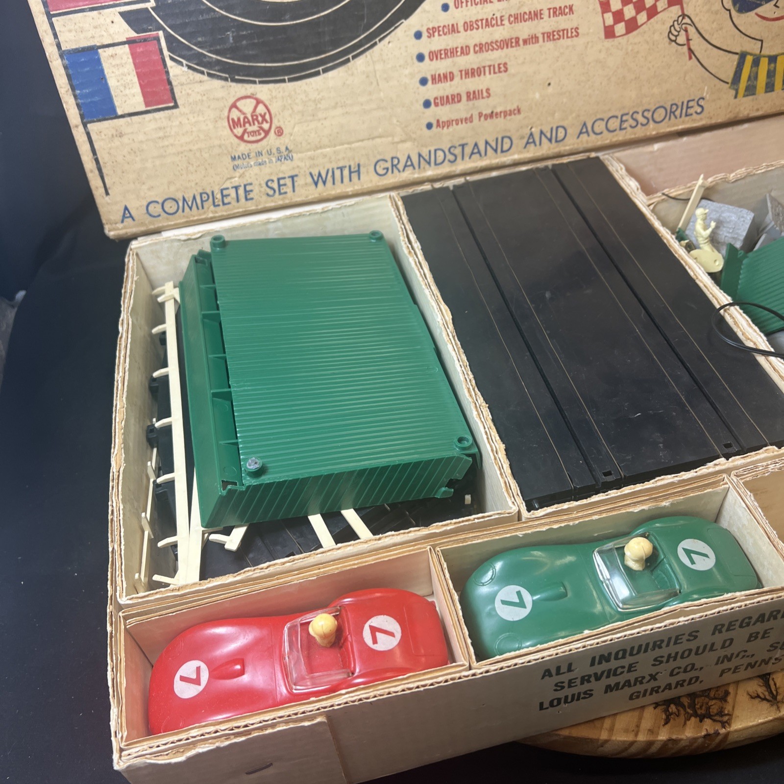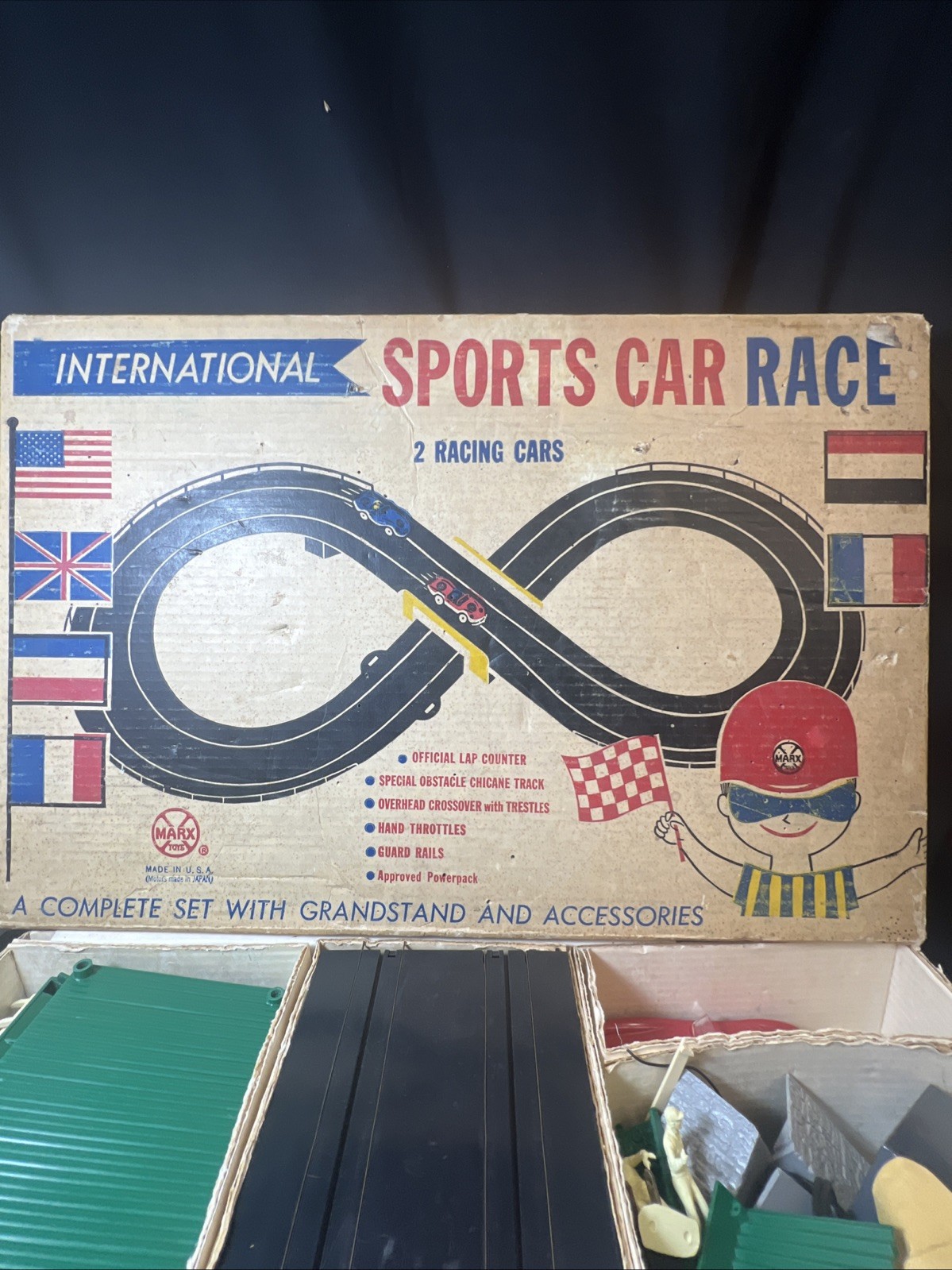 Vintage Marx International Sports Car Race Set 22510 w/ Box, 2 Race Cars, Track