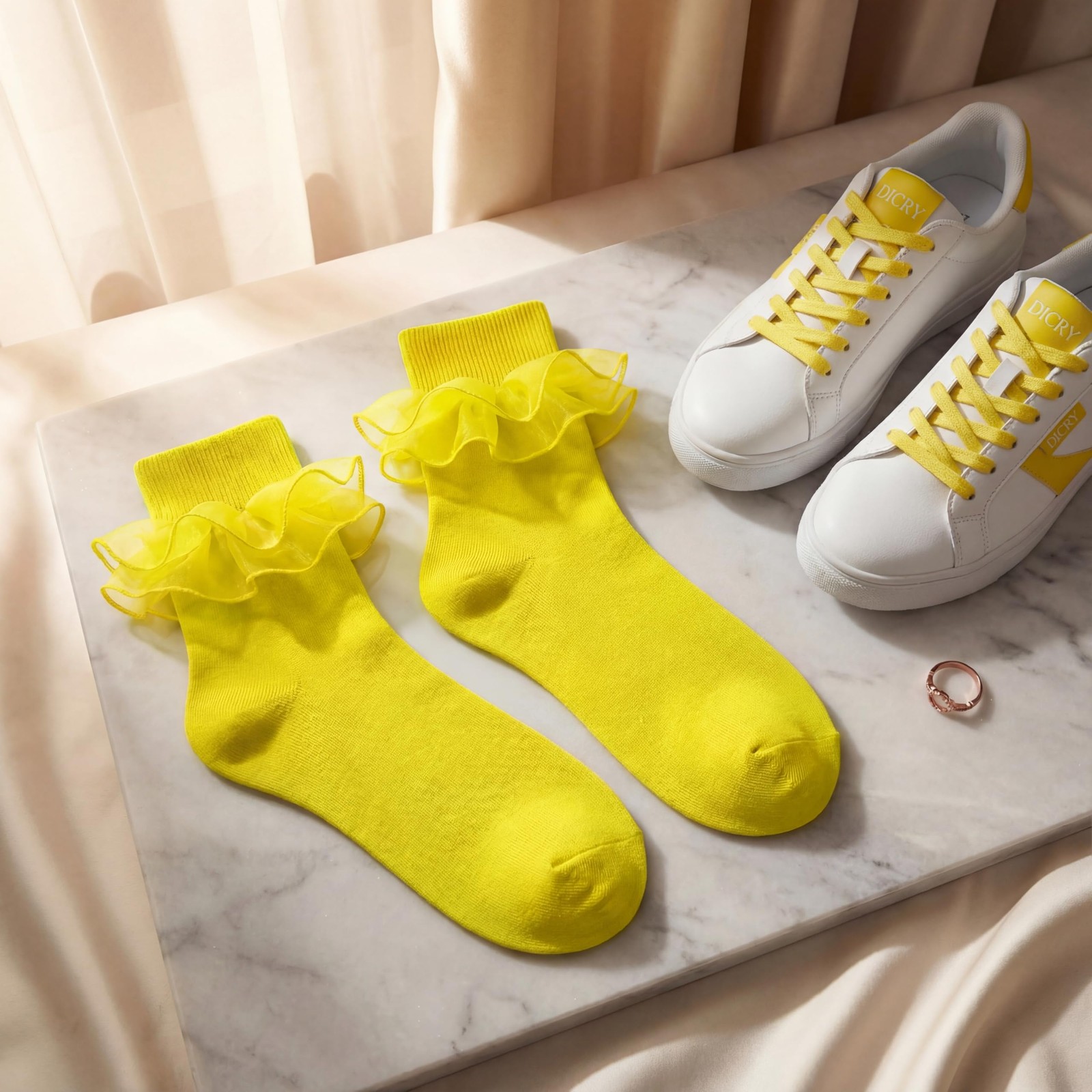 Socks for Women Big Ruffle Socks with Turn Cuff and Double Lace 9-11 Yellow